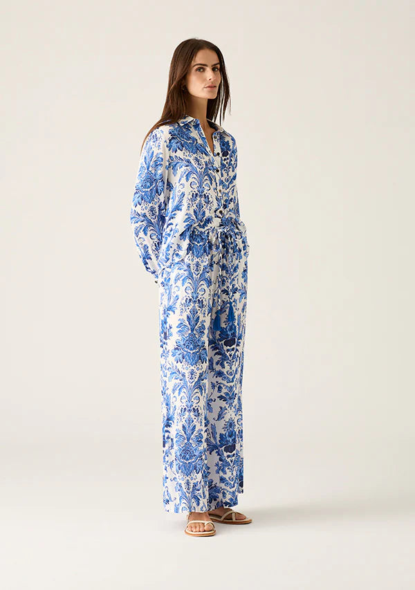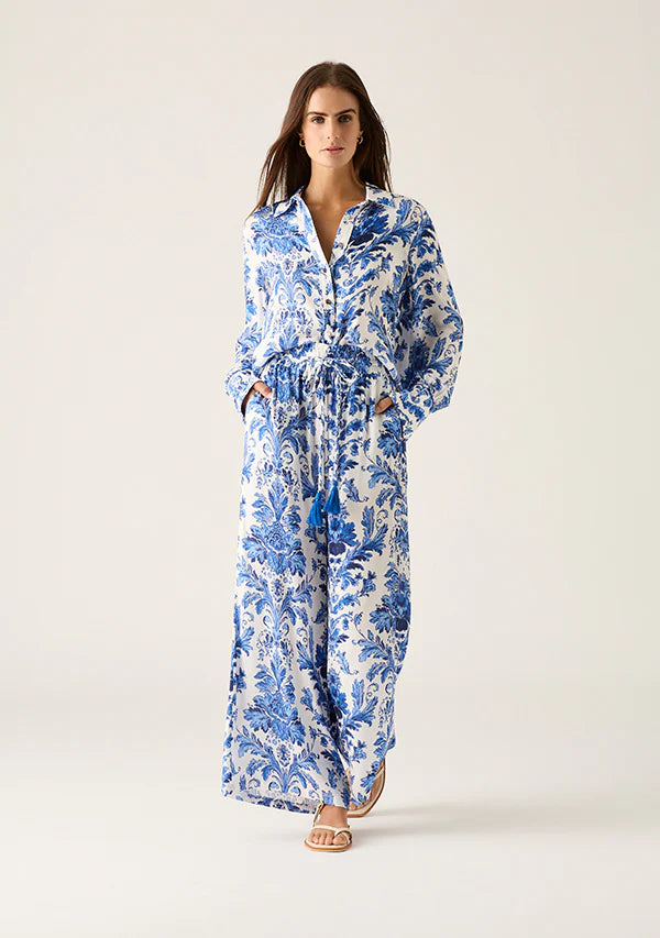 Capturing the eye with mesmerising blue florals, this long sleeve shirt flows effortlessly through relaxed shaping, as it uses a lightweight fabric to enhance casual styling. Softly gathered through the back yoke, the shirt creates an easy shape to a curved hemline, while fastening neatly at the front with a row of gold-edged navy buttons, set below a classic shirt collar.