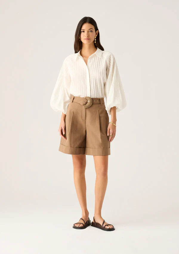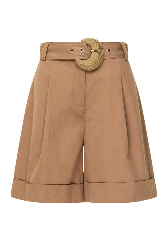 Relaxed in their shaping, these Bermuda shorts deliver essential summer styling in an effortlessly pairable shade of pale chocolate. Delivering a lightweight touch in a soft cotton blend, the shorts reveal a classic Bermuda silhouette accentuated by pleats at the front of the waist and broad cuffs at the hem, while adding further appeal in pockets at the hip and a crescent feature belt.