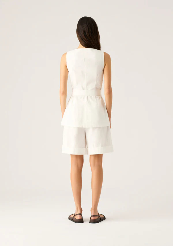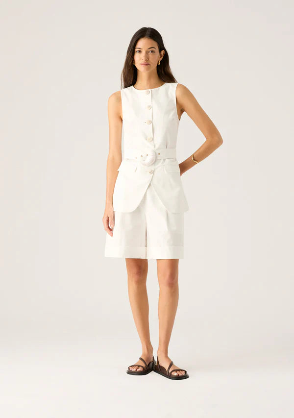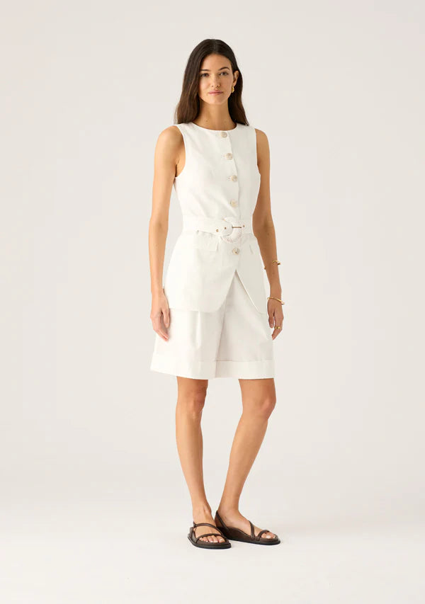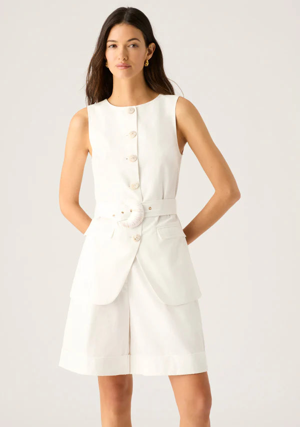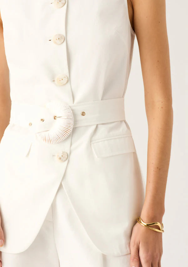 Creating a crisp neutral that will pair back seamlessly within your closet, this vest looks effortless in pale pearl white, which it complements with statement tortoiseshell buttons up front. Slipping over the skin in a soft cotton blend, the vest reveals slim sleeveless shaping to a slightly flared hem, while adding further detail in a fabric belt and sharp flap pockets at the hip.
