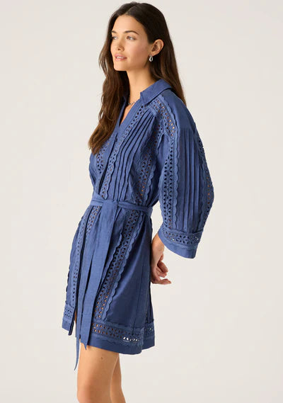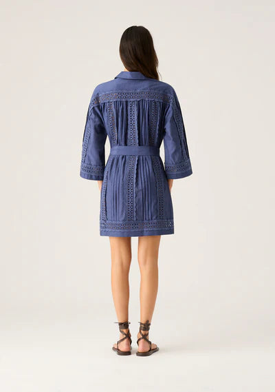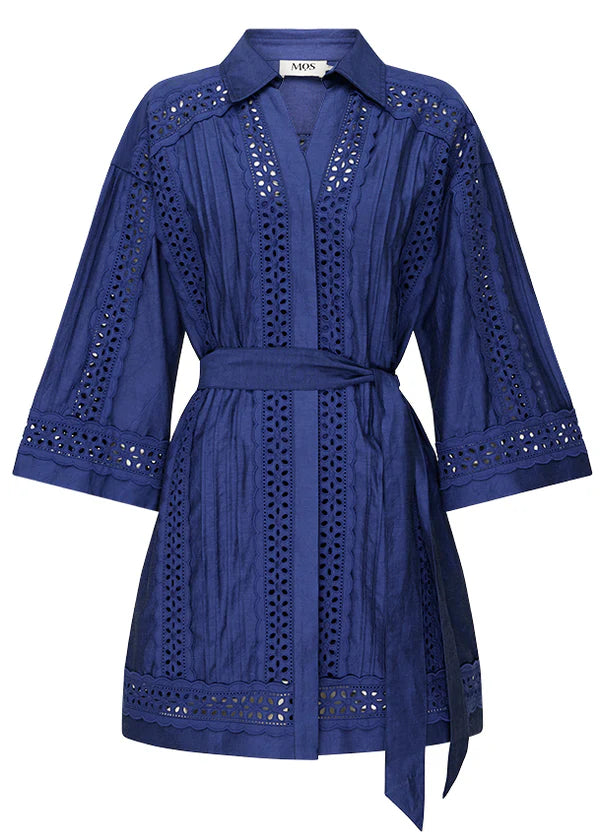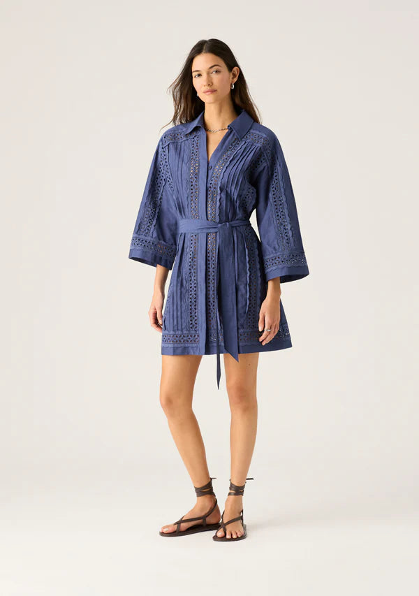 Using relaxed shaping to emulate effortless tunic design, this cobalt blue mini dress creates a beautiful summer look in pure lightweight ramie, gathered in at the waist with a draped self-tie belt. Accentuating its appeal with delicate cutout and scalloped frill detailing, the dress fastens with a concealed front closure, framed by a sharp shirt collar and broad long sleeves.