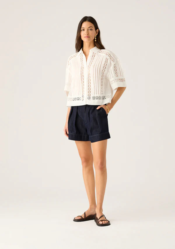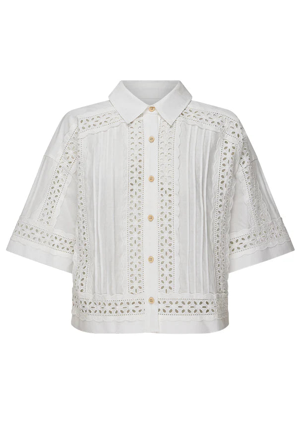 Caressing the skin with lightweight ramie, this white shirt creates an effortlessly feminine neutral, as it accents a relaxed, boxy fit with delicate lace cutout detailing. Fastening with a neat row of matching white buttons, the shirt reveals exaggerated shoulder shaping framed by wide short sleeves, with further detail offered in a crisp shirt collar up top.