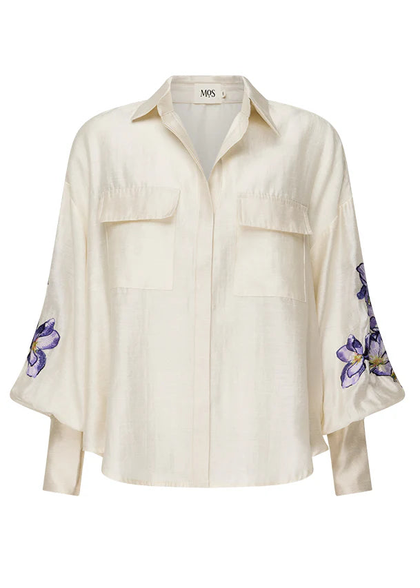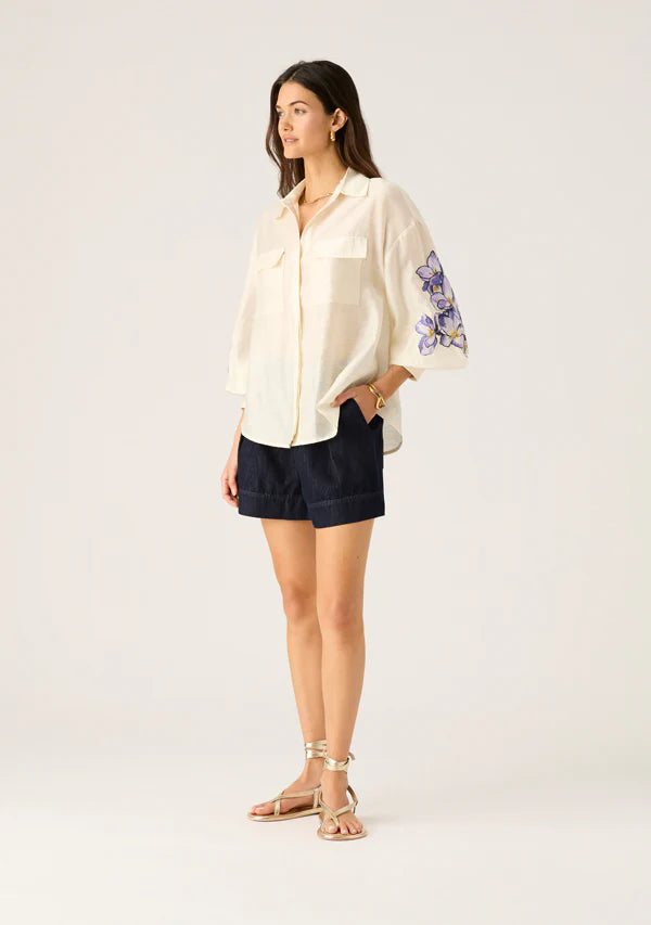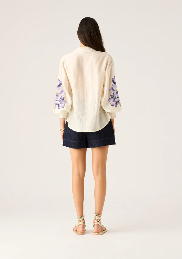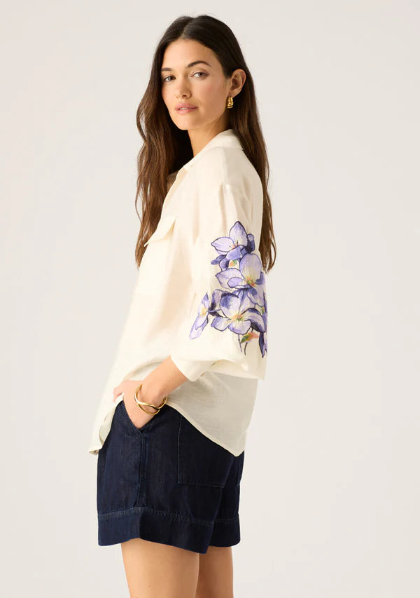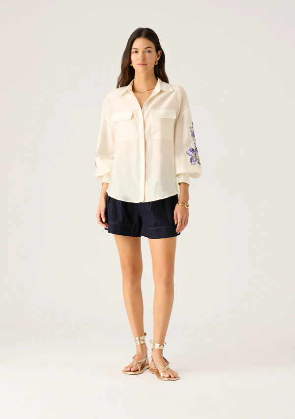 Revealing relaxed shaping in a lightweight linen blend, this ivory blouse keeps things cool and effortless through summer, complemented by an embroidery violet design at the sleeve. Extending to a curved hi-lo hem as it fastens neatly at the front with a concealed button closure, the blouse adds further detail in a relaxed collar, utility-style patch pockets and voluminous blouson sleeves.