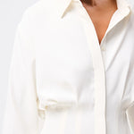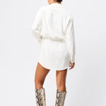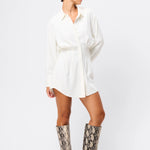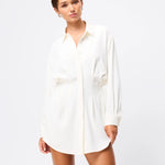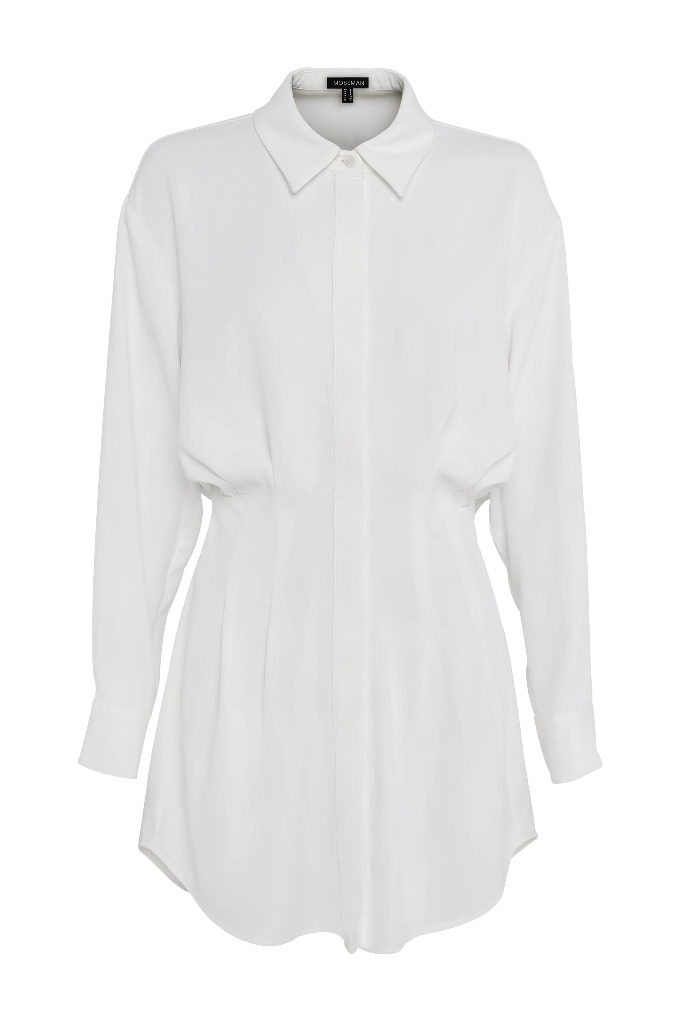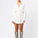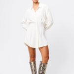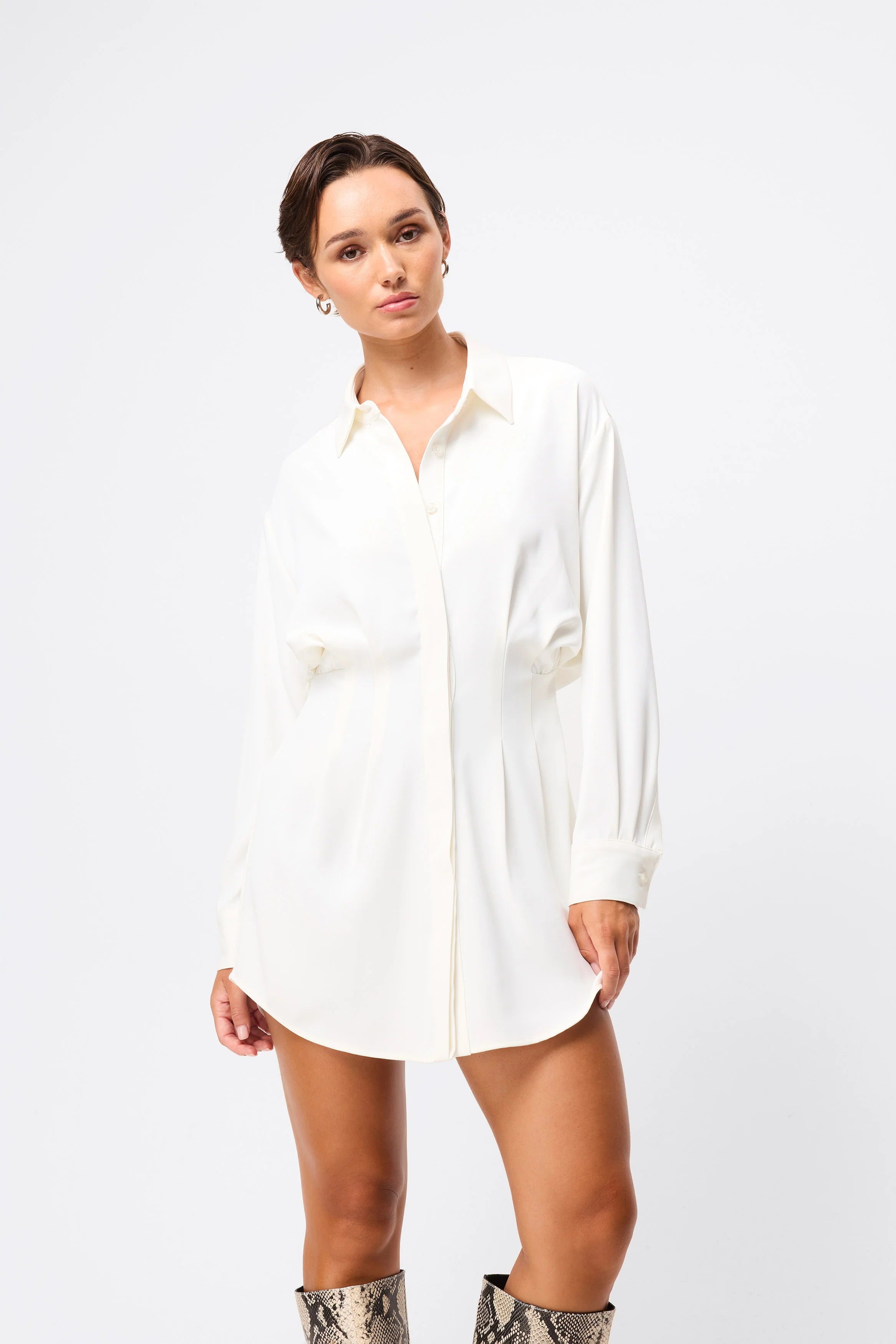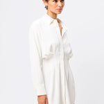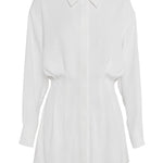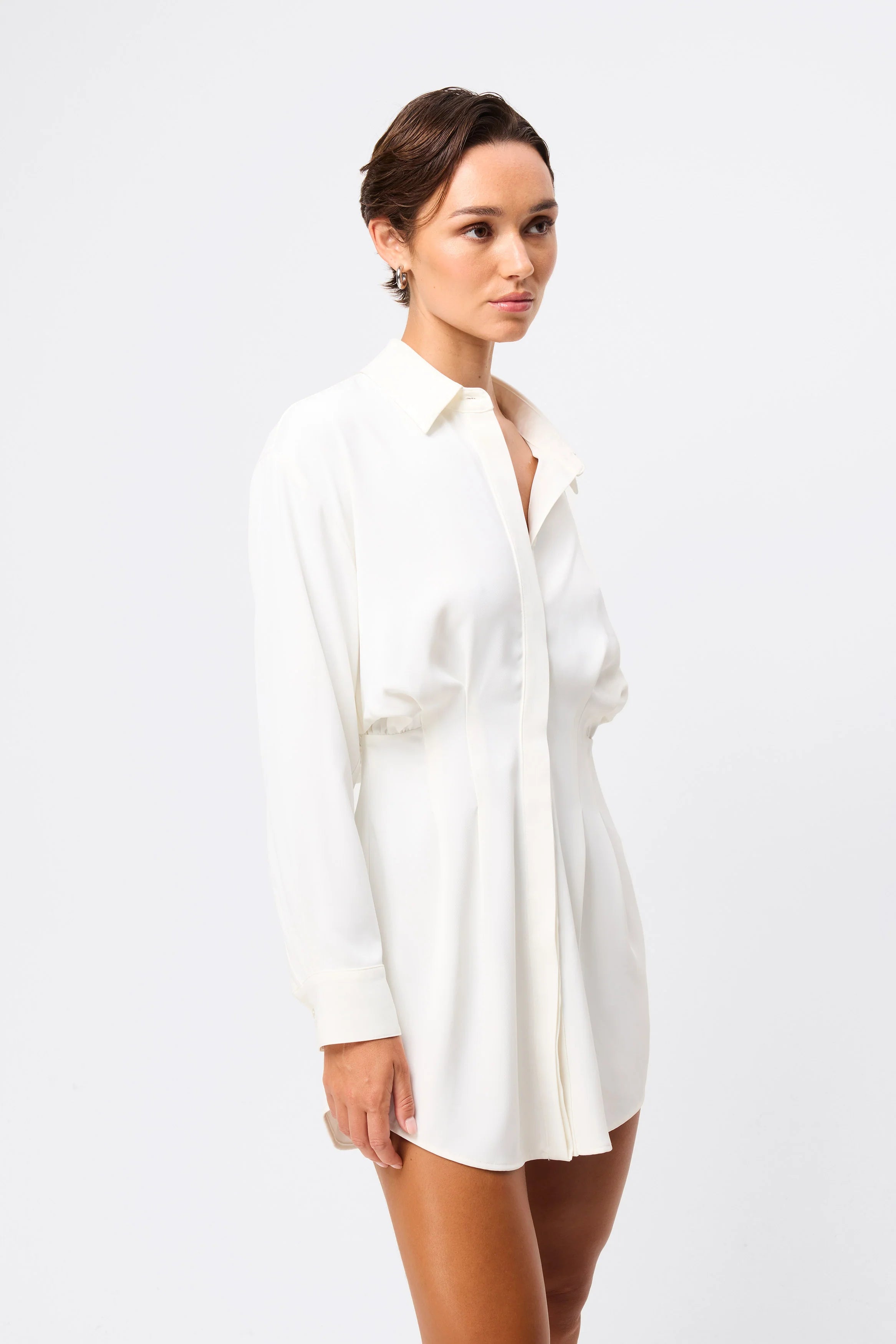 A modern essential reimagined, the Good Intentions Mini Dress in fresh white offers elevated ease. With a soft blouson silhouette, gently gathered waist, and fluid drape, this piece is refined by a shirt collar and concealed buttons through the front. The understated shape and clean finish make it a versatile go-to, whether styled with heels or paired back with flats.