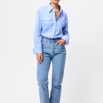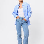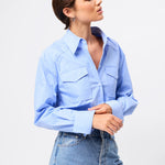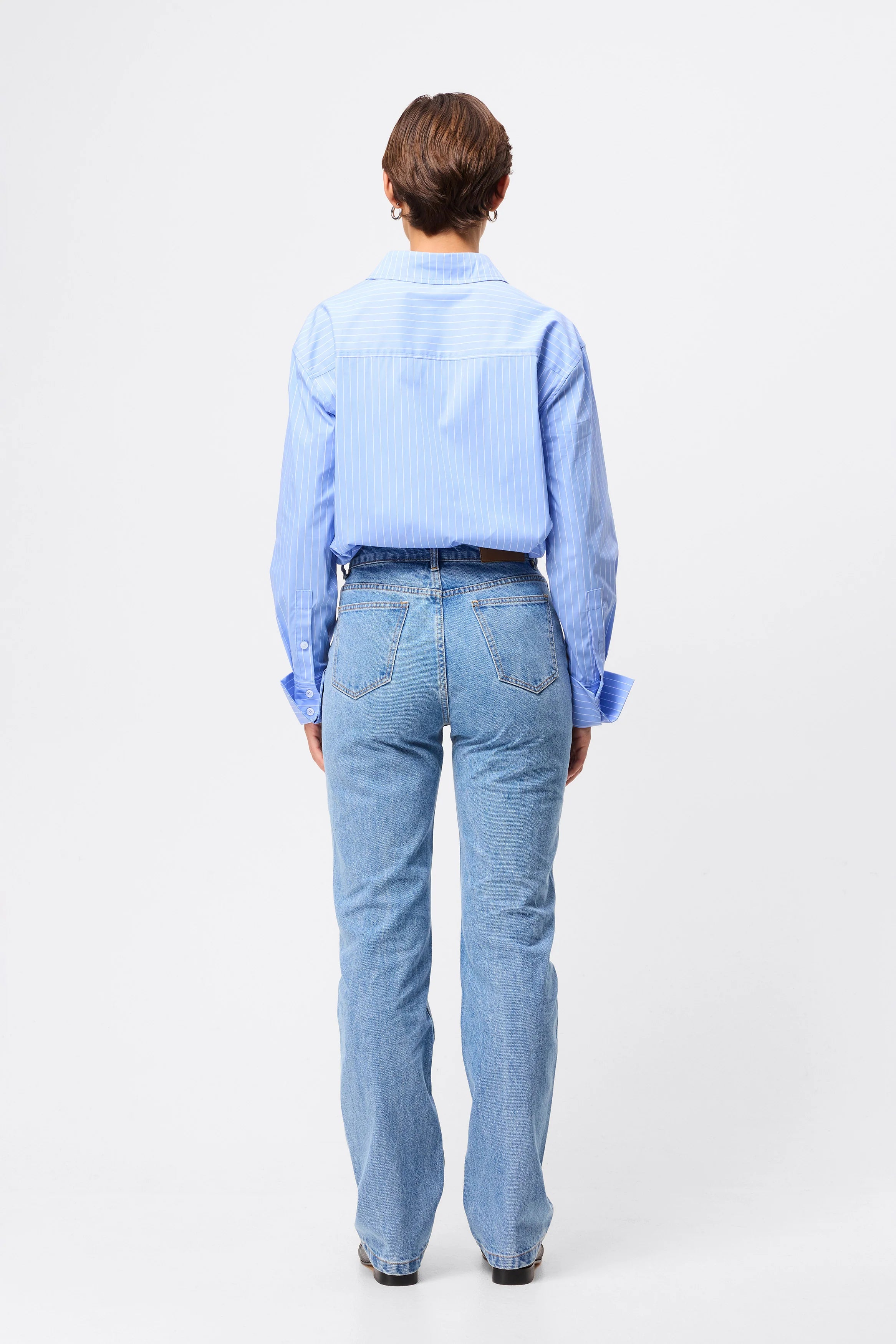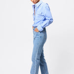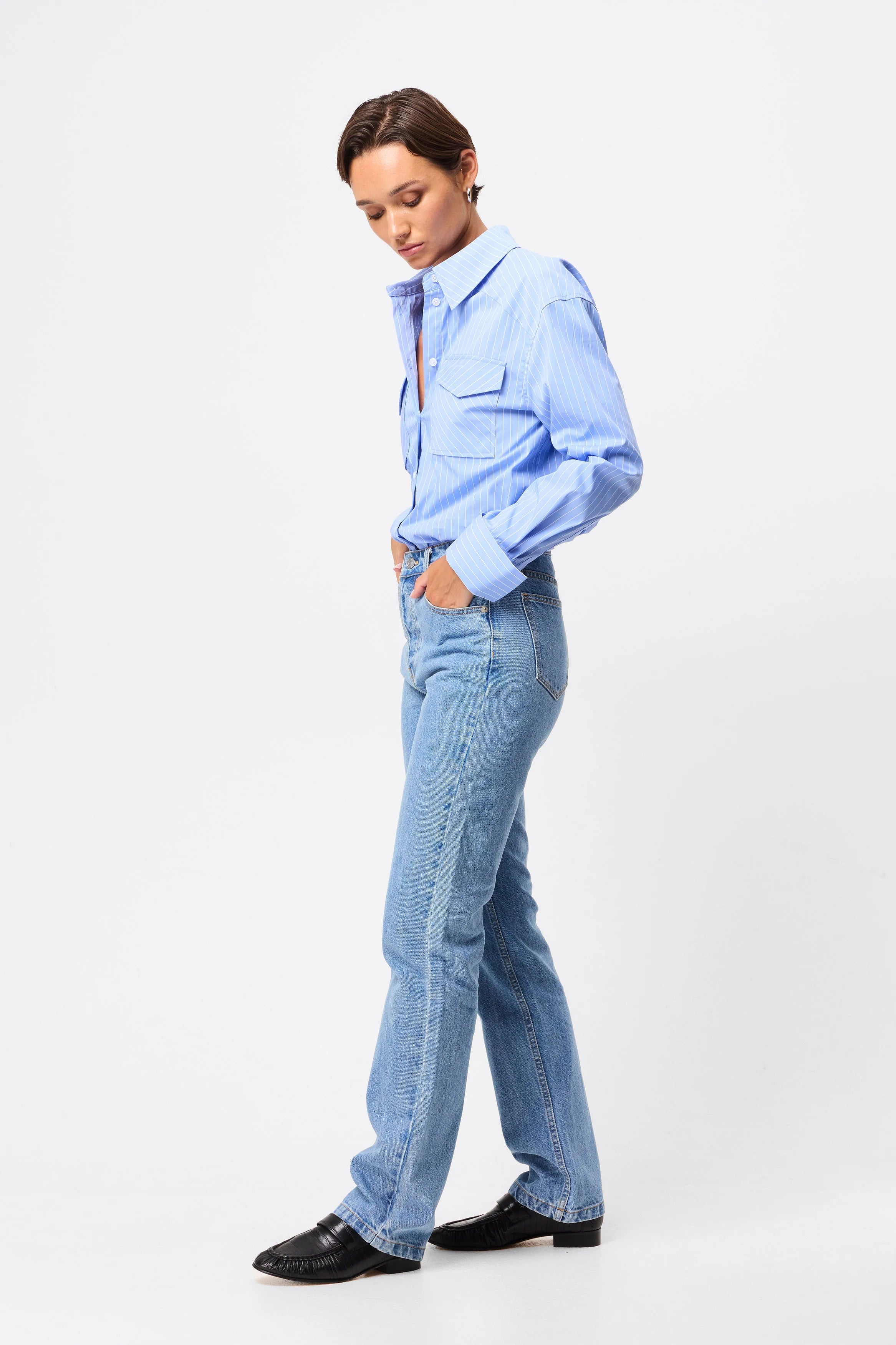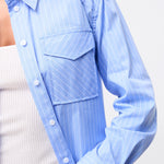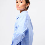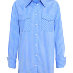 The Repeat After Me Shirt channels timeless tailoring with a modern edge. Crafted from a premium Australian cotton blend, it features crisp white stripes on a blue base, a classic button-through front, square patch pockets with angled flaps, a curved hemline, and extended cuffs for a polished finish. Versatile and effortless, it pairs just as well with denim for off-duty ease as it does with tailored pants for a more refined look. Add statement accessories to complete the ensemble with confidence.