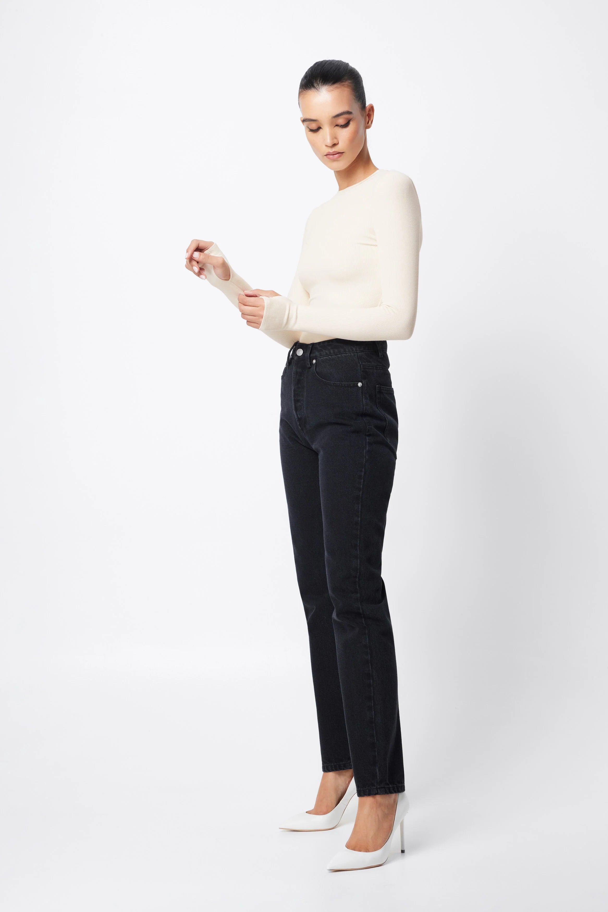 The Brooklyn Top in natural is your new go to ribbed jersey piece. This extremely soft double layered, lightweight top features a high round neckline and long sleeves with thumb openings. The top is conveniently designed to be paired with existing pieces in your wardrobe.