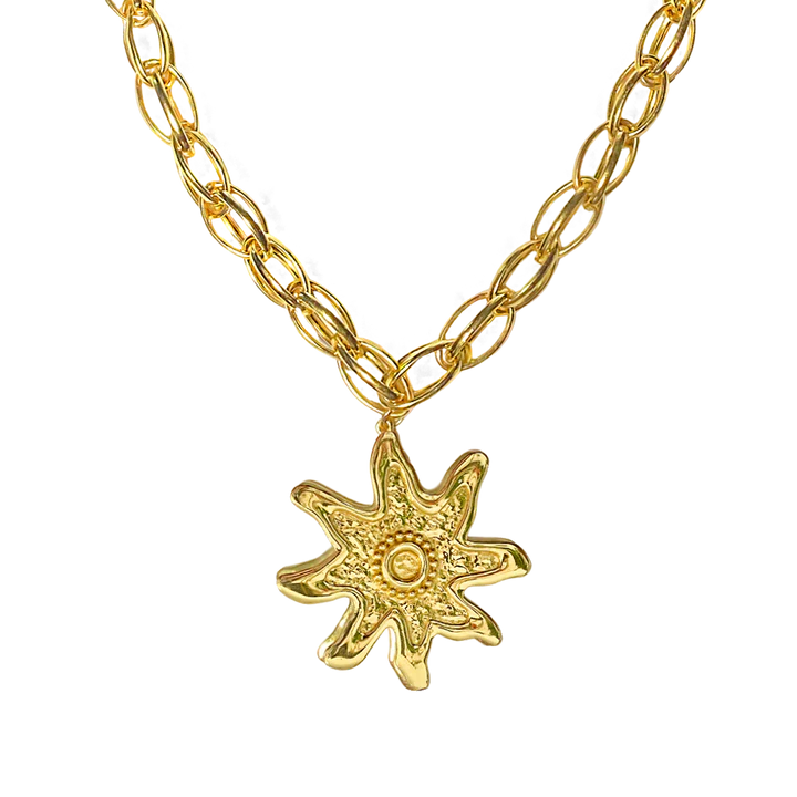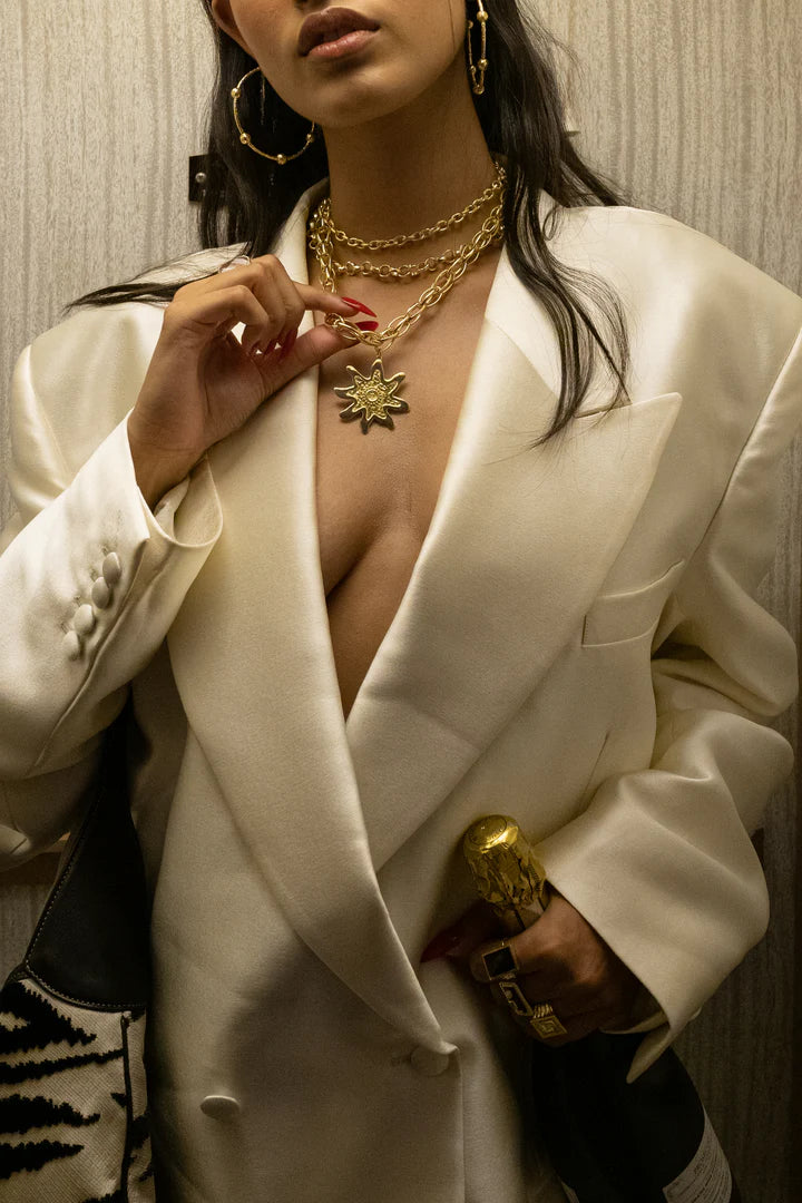 The Aria Necklace is a must have style from the new Primadonna Collection. The most beautiful orb detail gold chain with iconic Star motif pendant, ensures this standout piece stays bold yet feminine. Crafted with our signature hammered texture the Aria Necklace has a vintage touch but feels fresh and unique, its eye-catching design will make it a timeless addition to your jewellery collection.