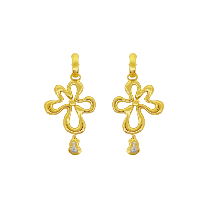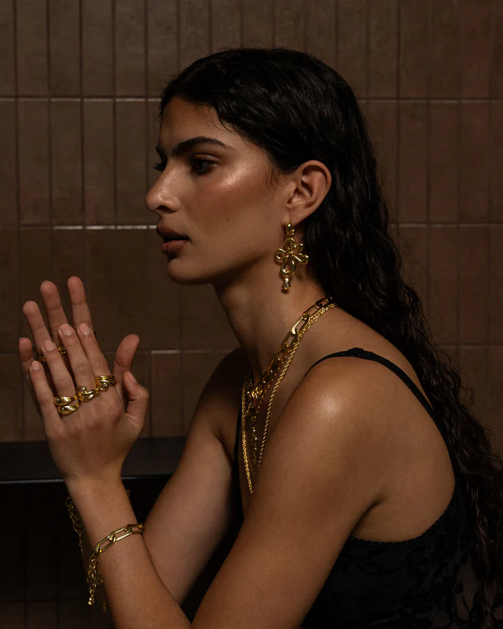 The DAHLIA Earrings in Gold evoke the playful side of nature’s elements, the ebbs and flows in water, the beautiful veining in untouched stone, the scalloping shores of the sea sides. The Dahlia boast a chic fluid motif suspended from a perfect and easy to wear mini hoop in a high polish finish. Sized to perfection suitable from day to night, these beauties are sure to become the favourites of the Ambrosia collection. Pair with the Maeve necklace to create a gorgeous matching set.