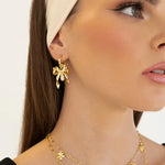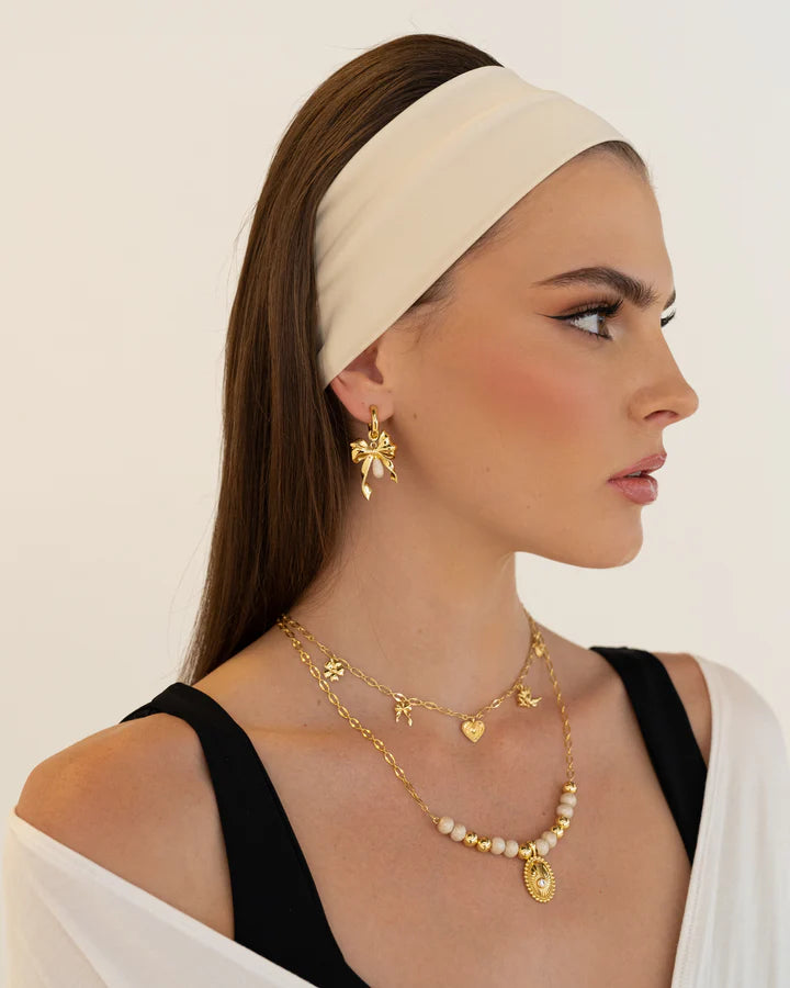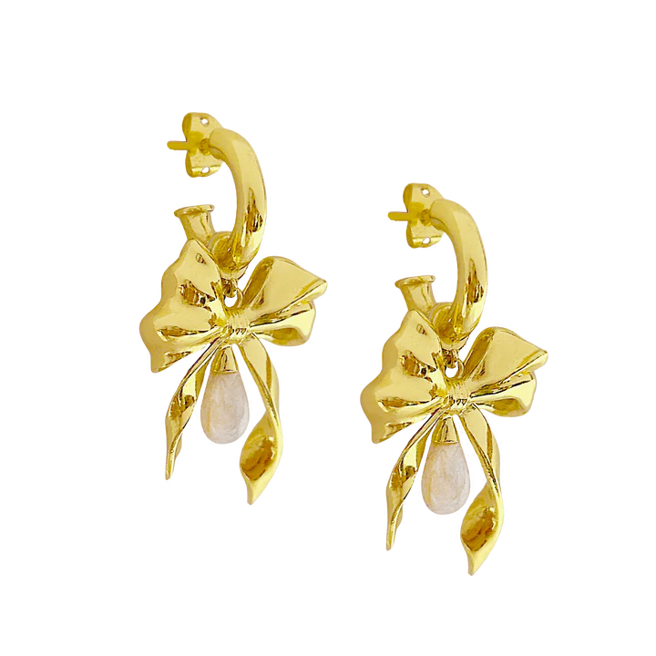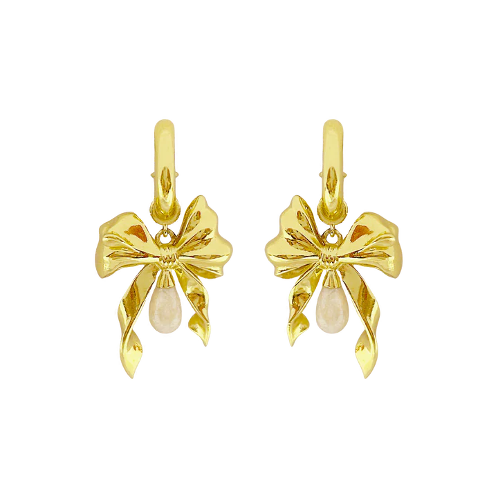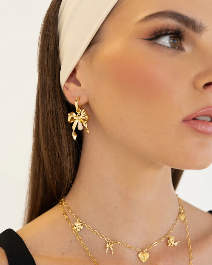 These golden Emily Earrings exude charm, with a gorgeous bow motif and a creamy pearlescent drop as the finishing touch. They strike the perfect balance between subtlety and style, making them your go-to jewels for any occasion. Drawing inspiration from one of the most feminine motifs of all time - HOW CUTE IS THE BOW! She is classic, chic, and oh-so-pretty, these earrings will quickly become your all time favourites.