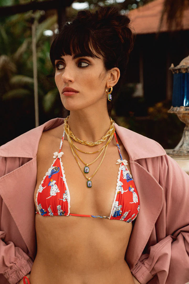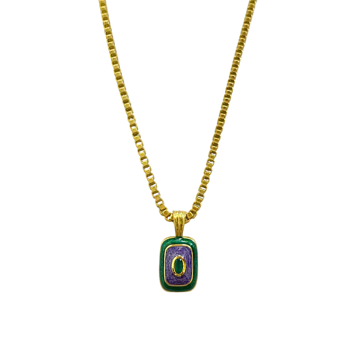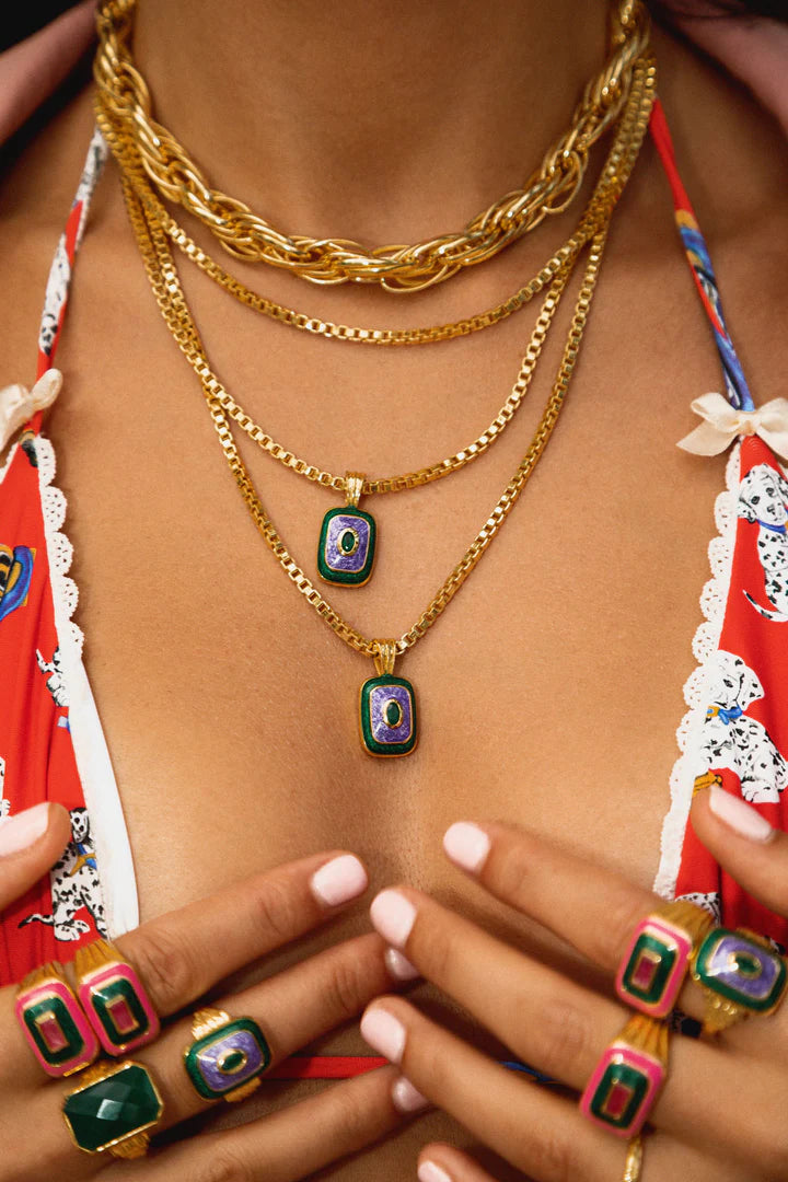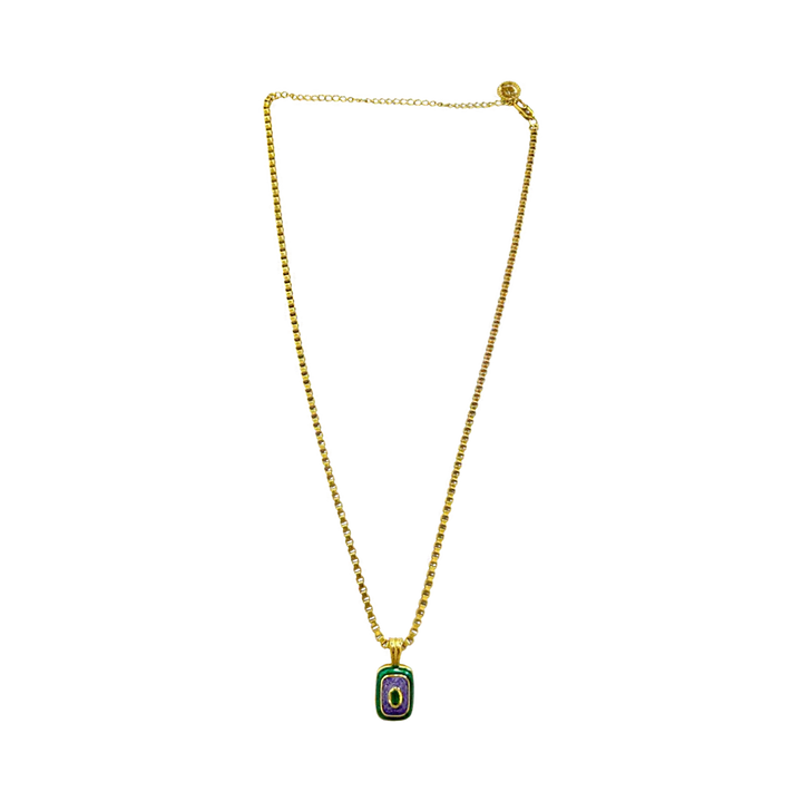Introducing the Eva Necklace, she is vintage glamour at its finest with a playful edge in true MM fashion. She will have you feeling sexy, bold and sophisticated with any outfit day or night. Starring the Mirage motif... a beautifully crafted rectangular pendant featuring a faceted green onyx gemstone set in pearlescent green and purple enamel. Eva is a showstopper all on her own and also perfect for layering. You won't want to ever take her off!