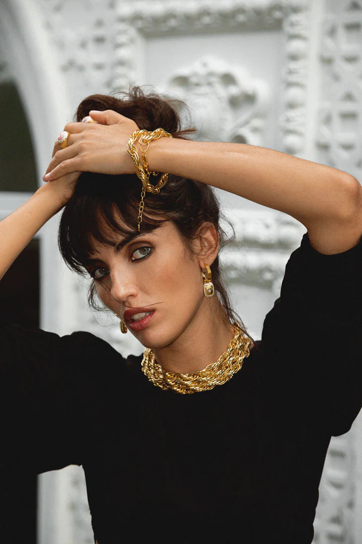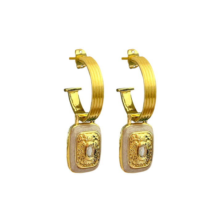 The Mara's are the epitome of classic style with a fabulous yet playful twist. They're beautiful, chic, and oh-so sassy… Crafted on a chunky fluted hoop, they feature a unique rectangle motif drop, combine with hammered gold texture, pearlescent enamel and eye-catching faceted Crystal Quartz gemstones. The Mara Earrings can be worn from day to night, with dazzling yet sophisticated flair that’s sure to turn heads. Enjoy the perfect balance of classic yet flirty with these beauties - don't be shy, be bold honey!