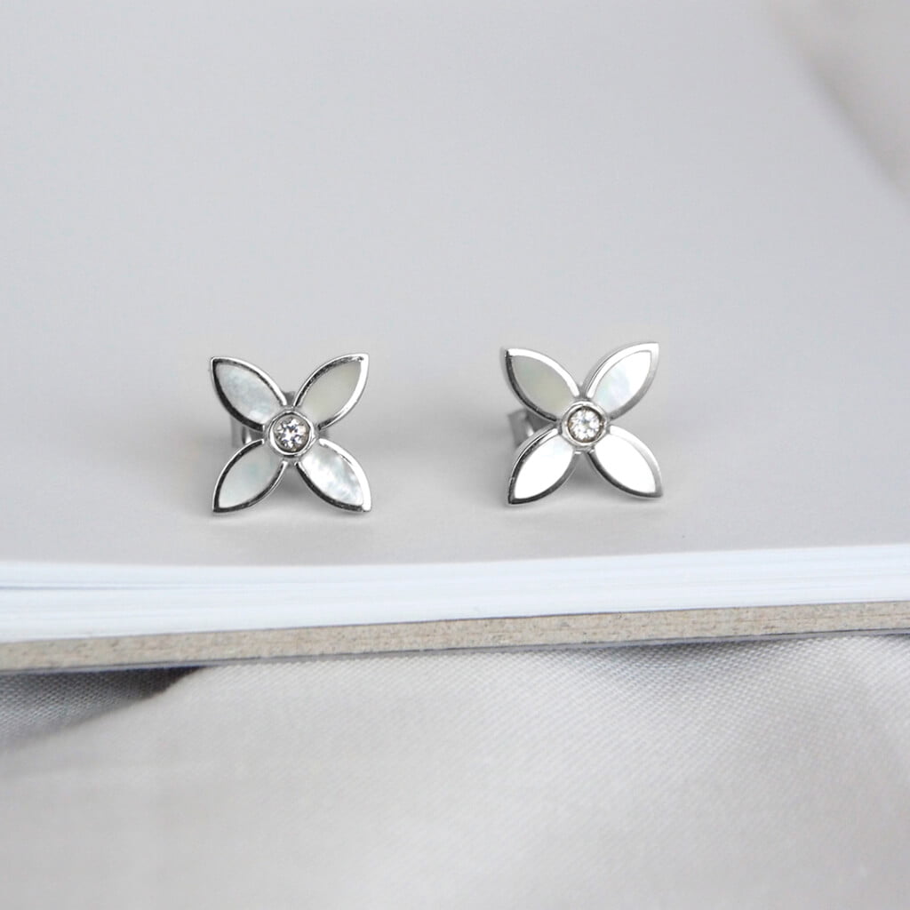 - The stud earring features Mother of Pearl and measures 1.5 cm x 1.5 cm