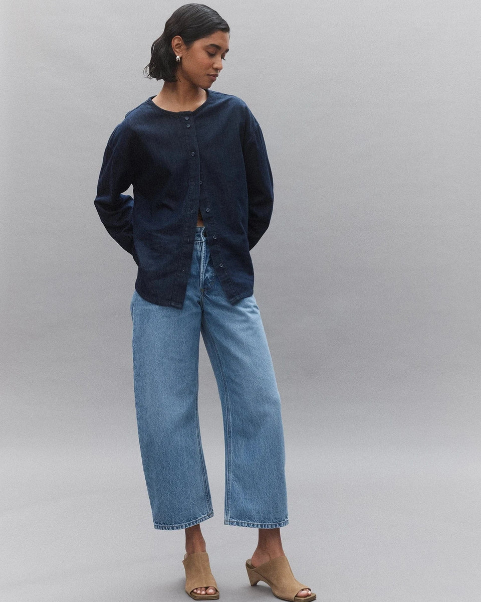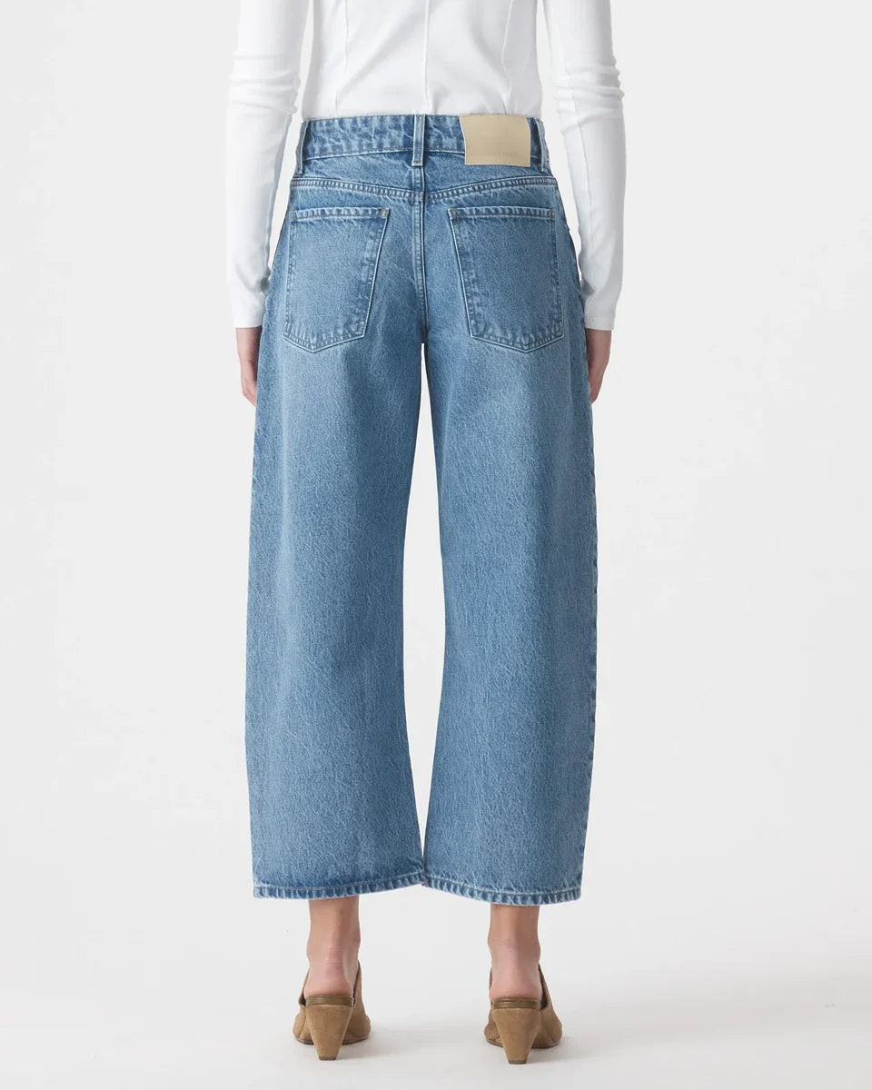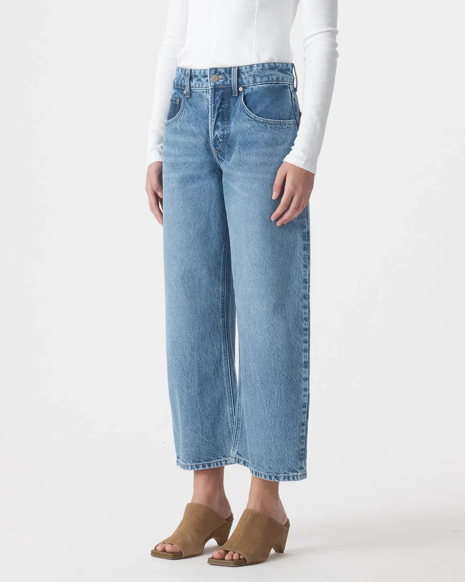 The easy wide leg jean. The Nadia Jean sits below the navel, is relaxed through the hip and leg, with a curved wide leg profile and finishes at the ankle. Features a button fly. Crafted from premium rigid denim.