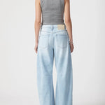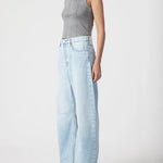 Our bow-legged jean. The Vera Jean sits just below the navel, is relaxed through the hip and leg, with a bow leg profile and finishes at the top of the shoe. Features a knee dart and button fly. Crafted from premium rigid denim.