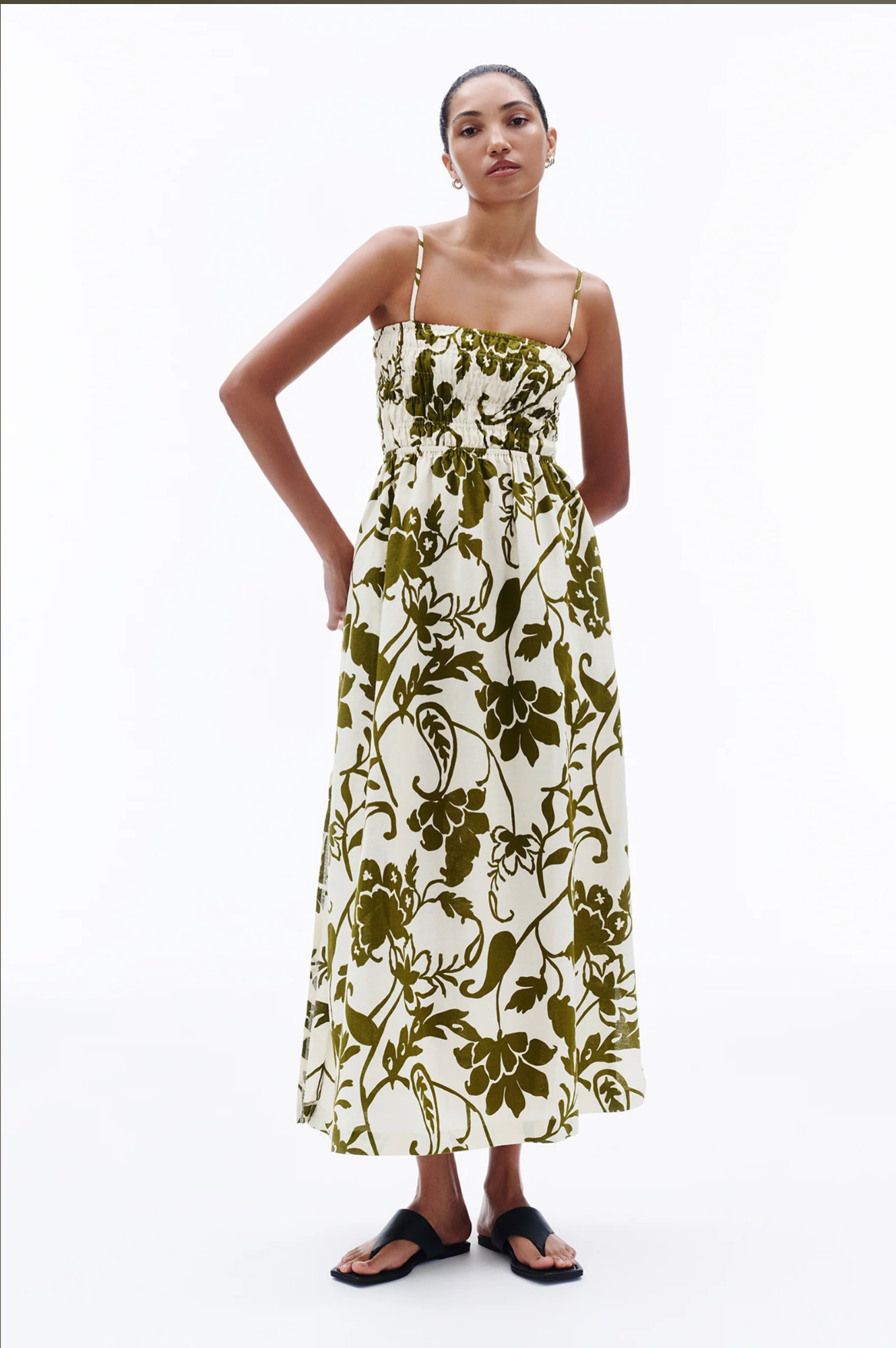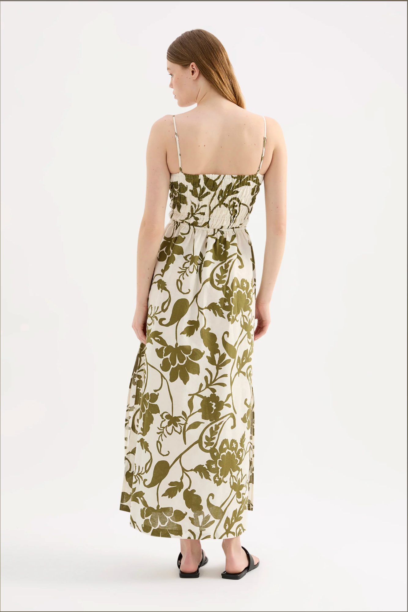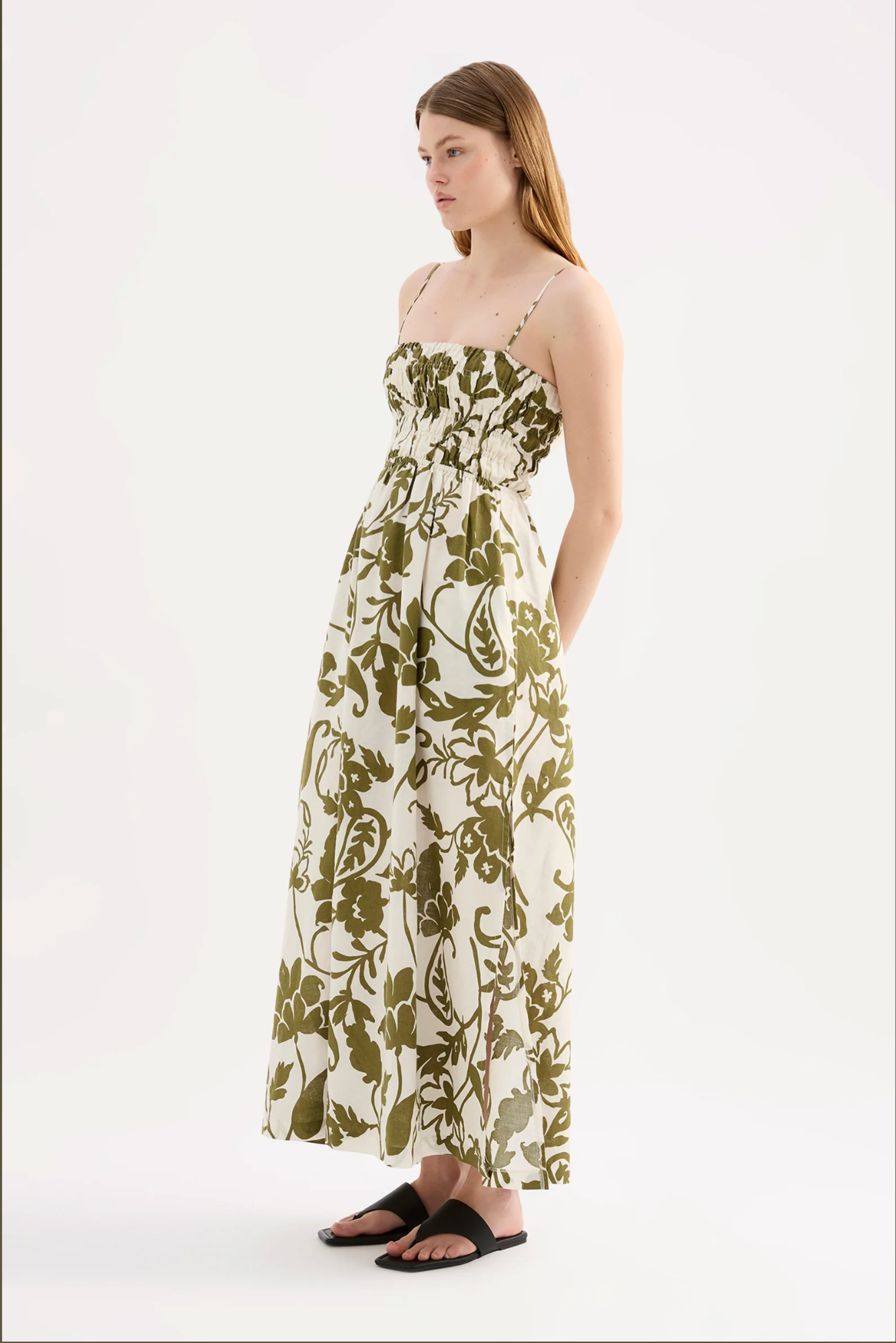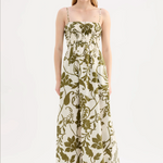 The Dahlia Maxi Dress is made from a linen blend fabrication in our exclusive Dahlia print. The silhouette is fitted to the waist with an a line skirt finishing just above the ankle. Features include a shirred bodice with a square neckline, adjustable straps and side seam pockets.