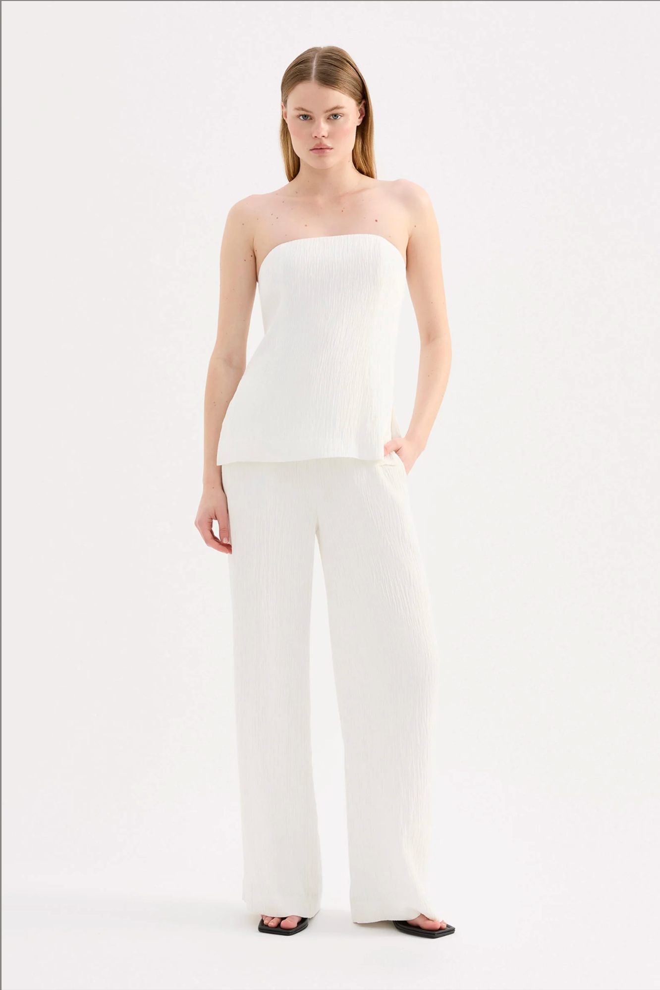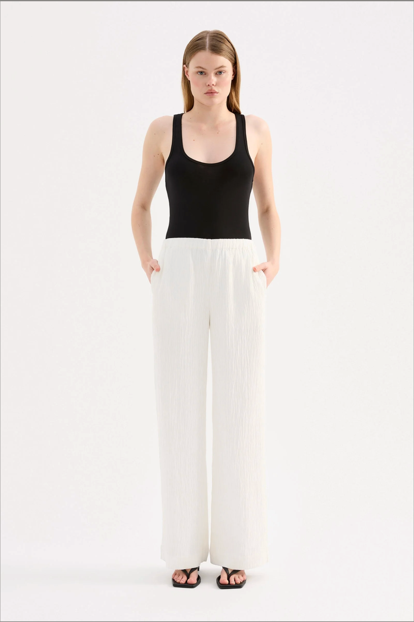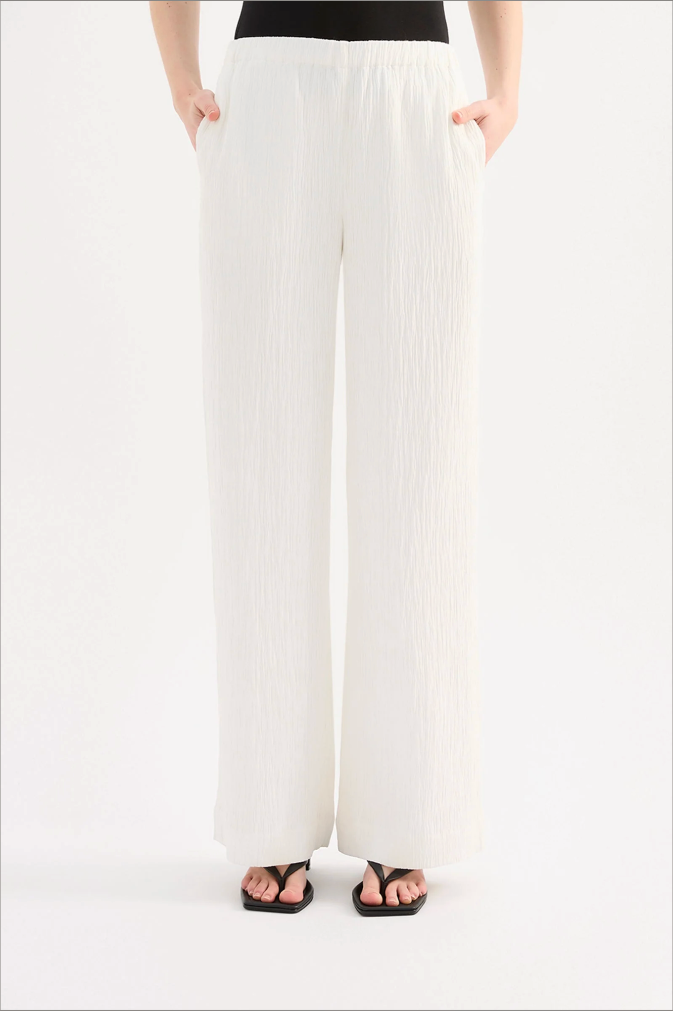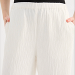 The Danika Pant is made from a crinkle textured fabric which has a dry, lightweight hand feel. The silhouette is relaxed with a straight, full length leg. Features include an elasticated waistband and side seam pockets.