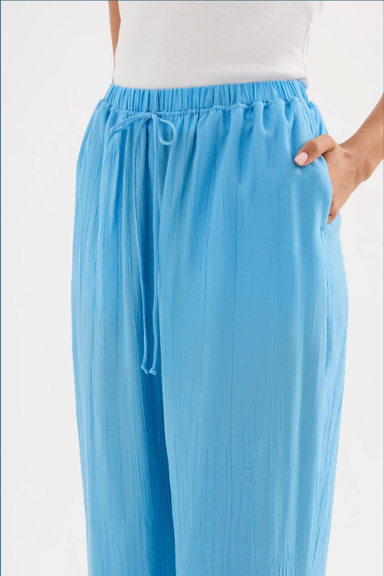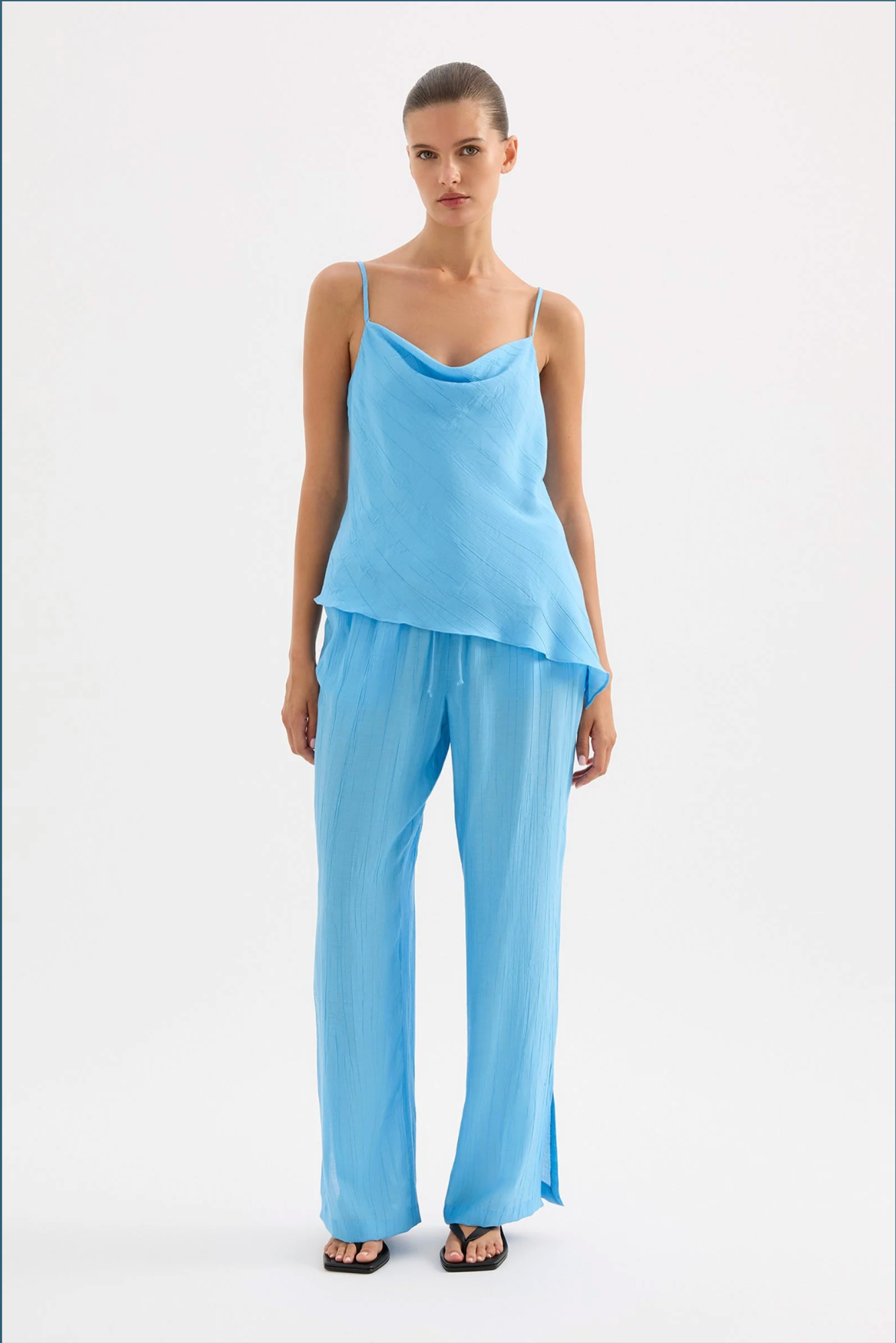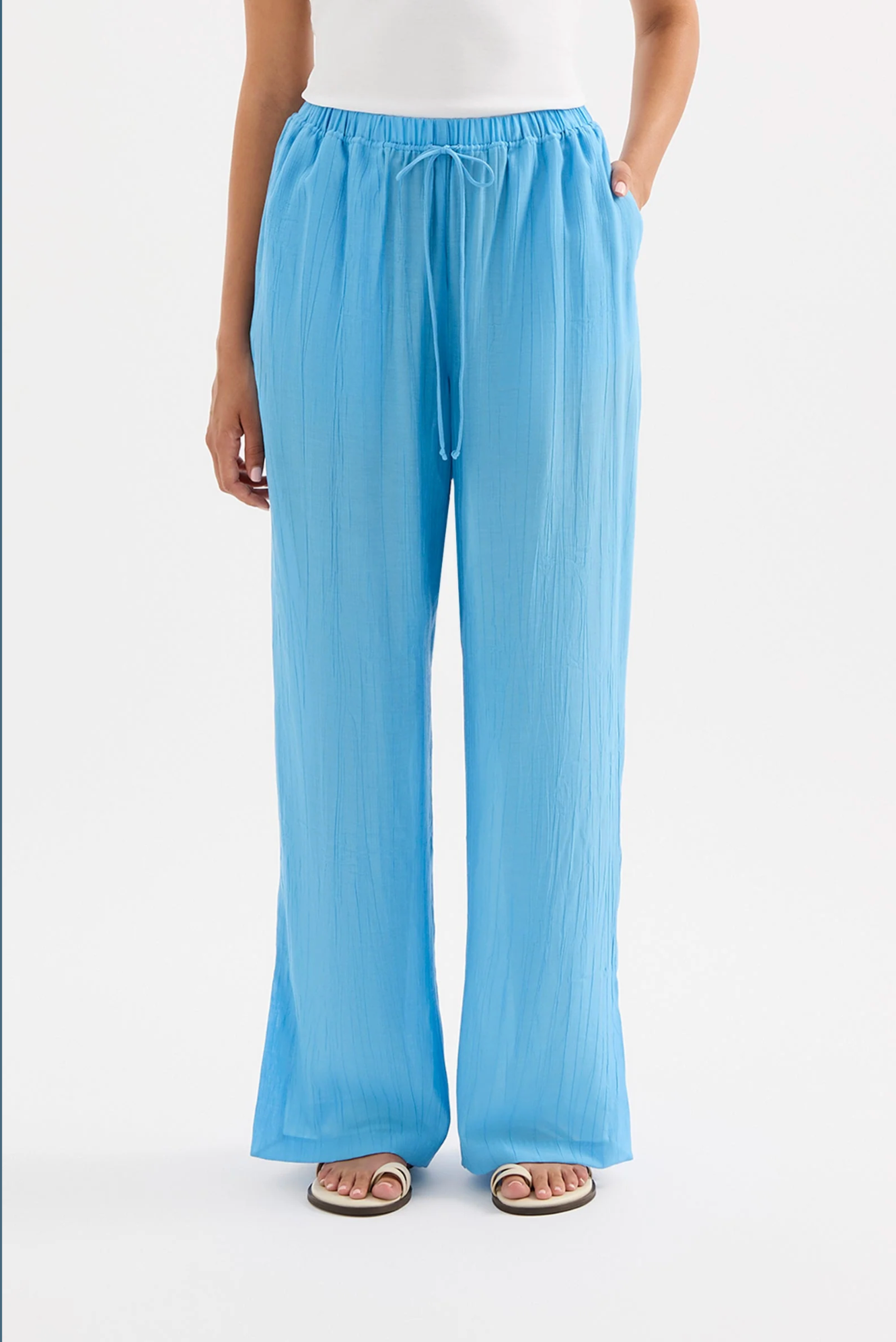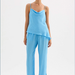 The Demi Pant is made from a viscose blend fabric which is lightweight and has a soft, textured hand feel. The silhouette is a relaxed wide leg, full length pant. Features include an elasticated waistband, side seam pockets and slits at hem.