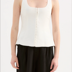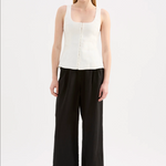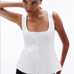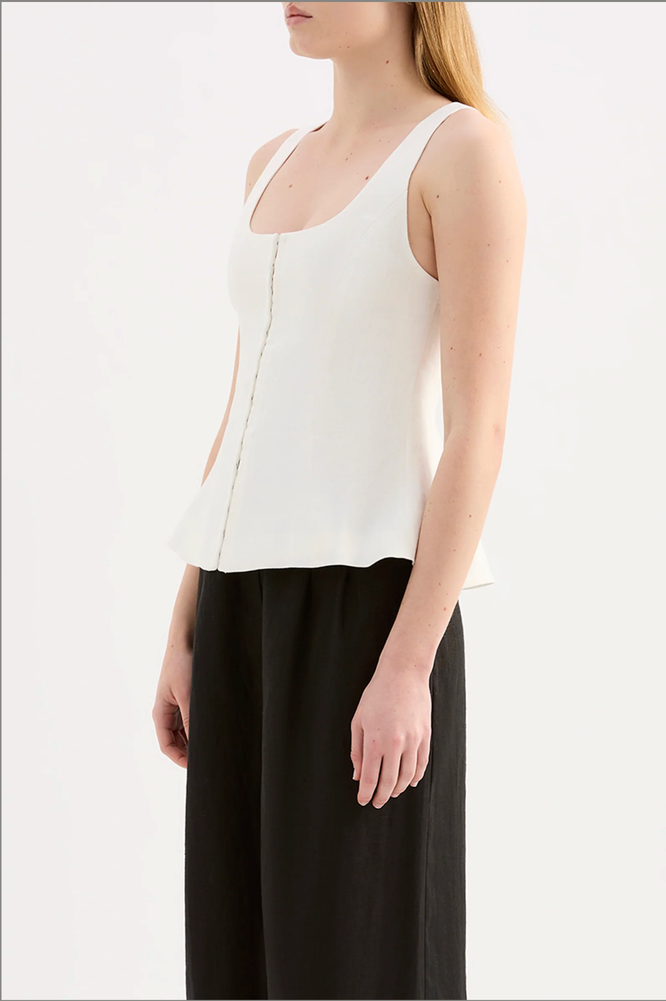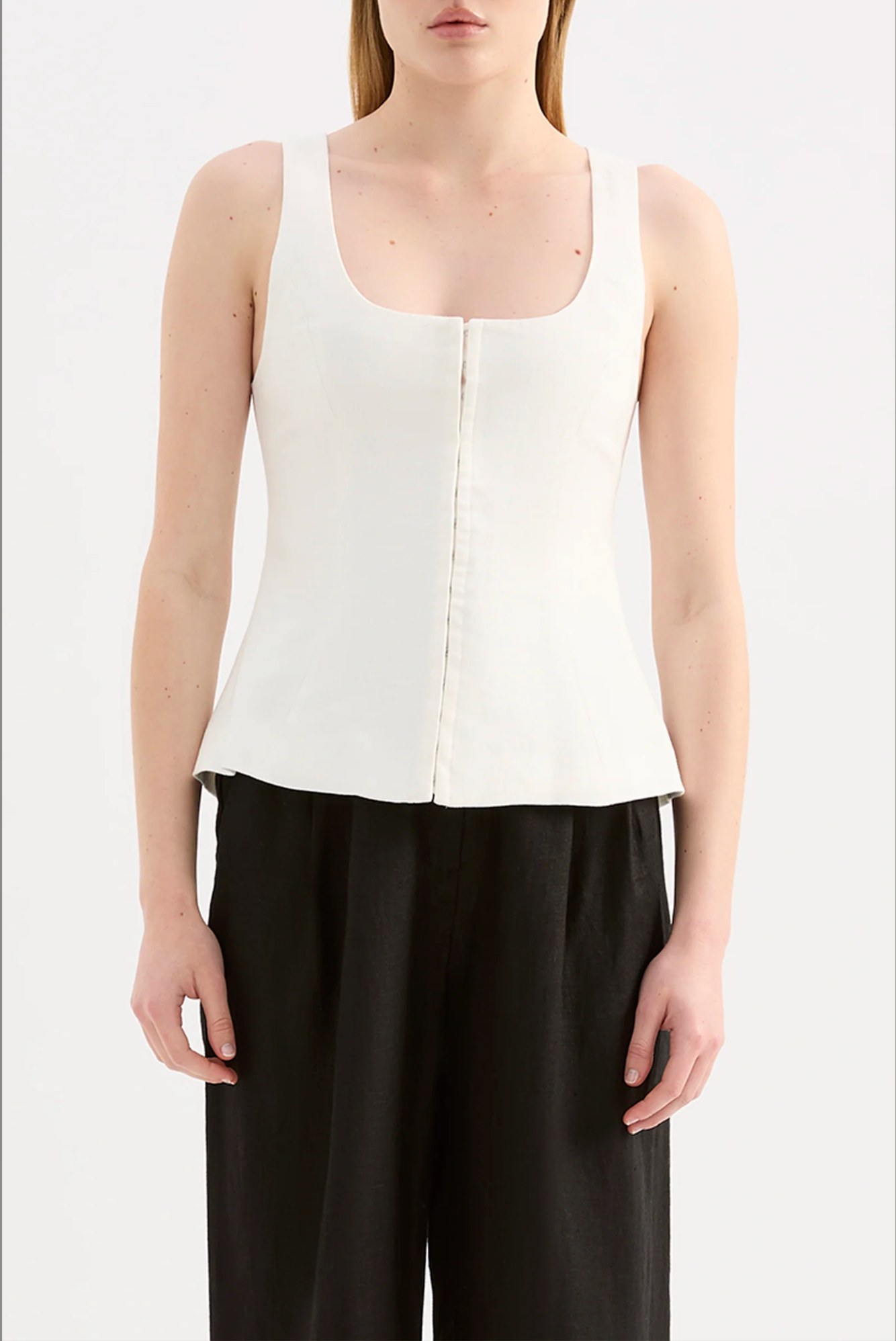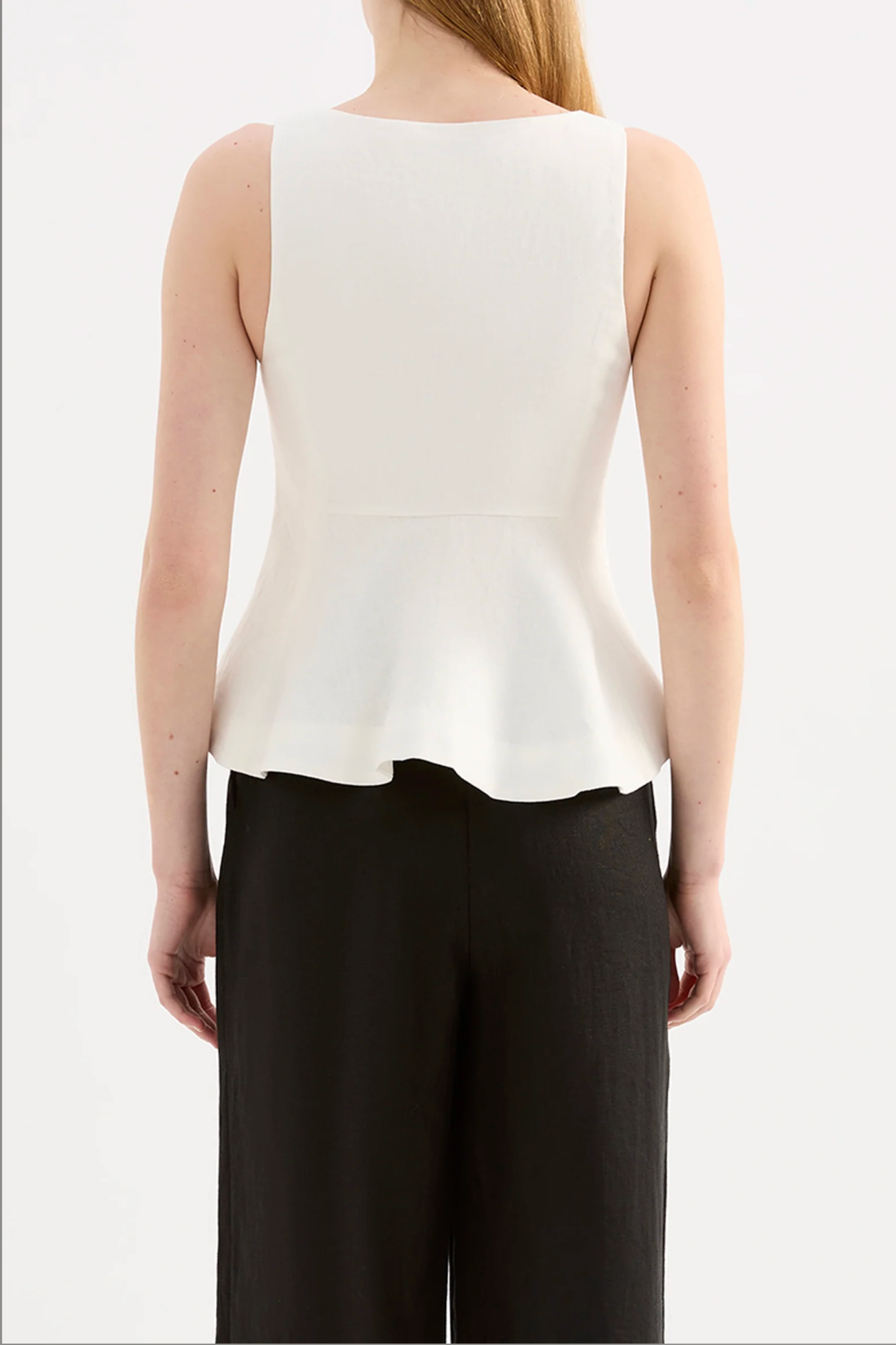 The Quinn Linen Vest is made from 100% linen which has been washed for a soft, breathable hand feel. The silhouette is tailored and slim fitting with a front opening. Features include a scooped square neckline, hook and eye opening and back peplum. This vest is fully lined.