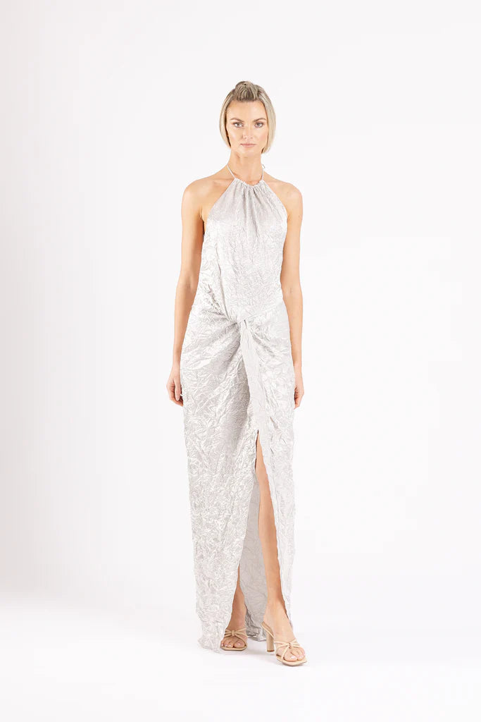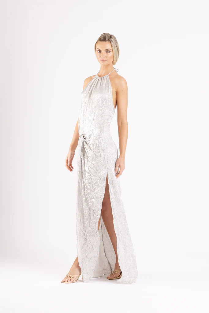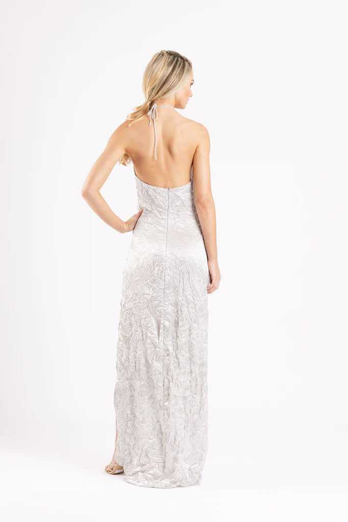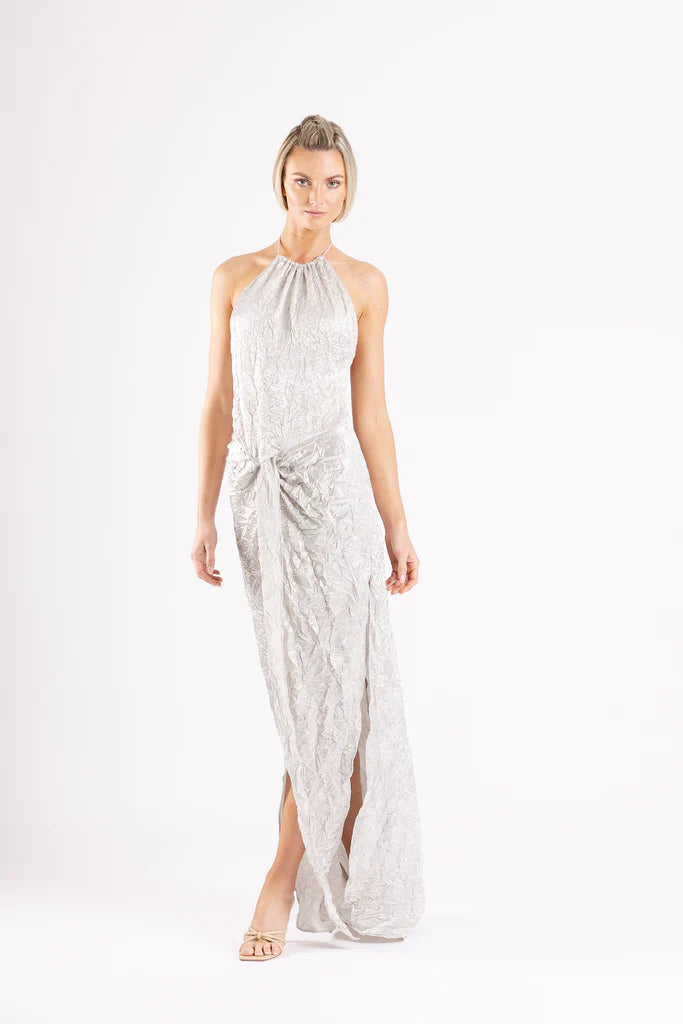 The Andrea Maxi in Silver Varakh is crafted from a crushed polyester. Gathered at the neckline this piece features a streamline bodice that is complimented by a backless silhouette. A waterfall drape details the centre of the piece, forming the skirt which is cut into to create two splits, one central and one right bearing.