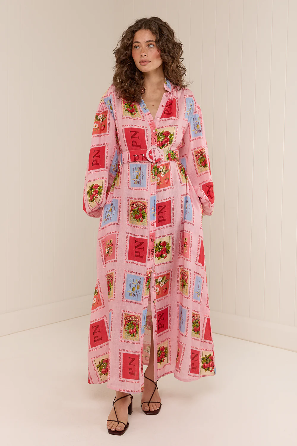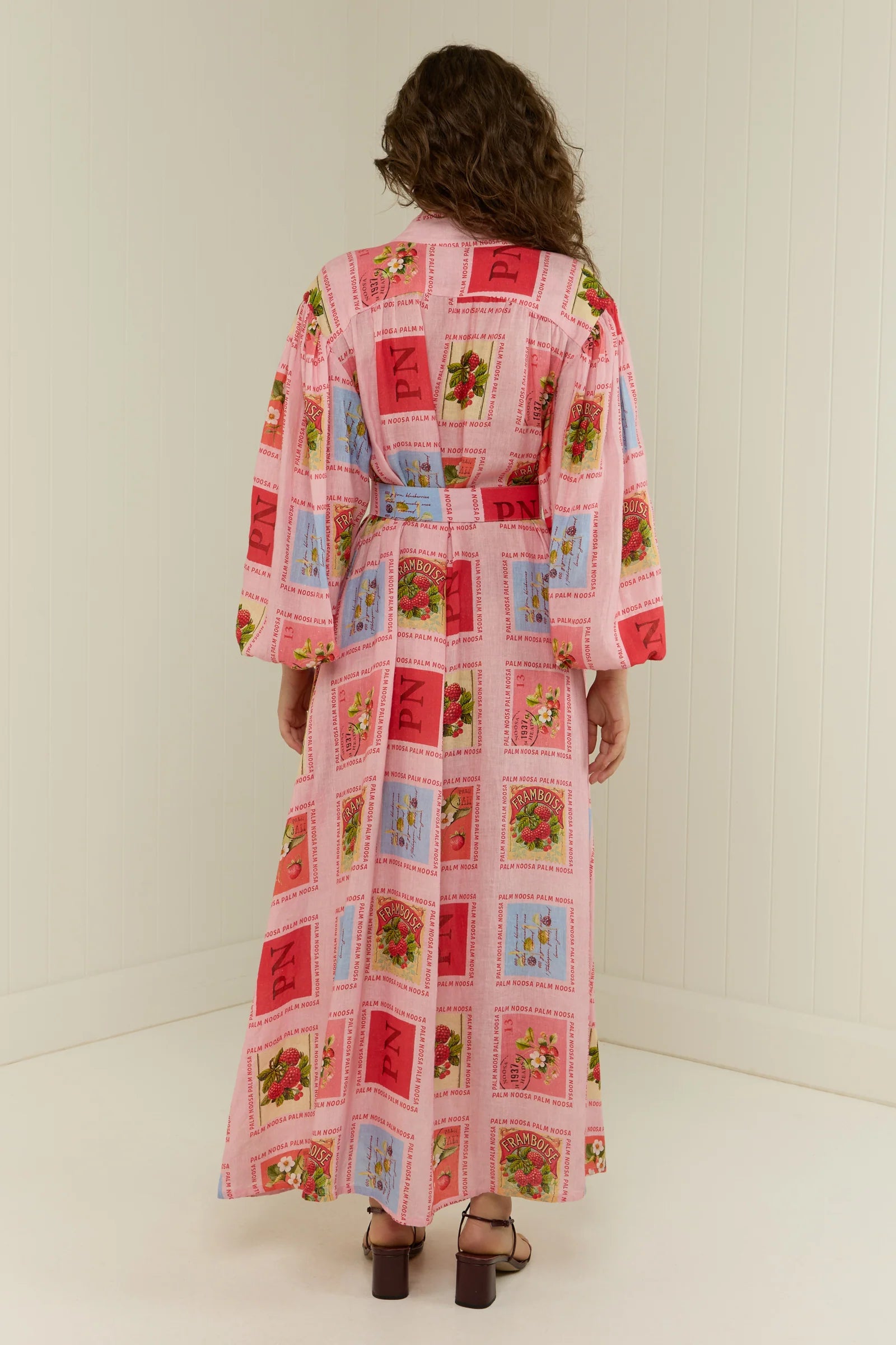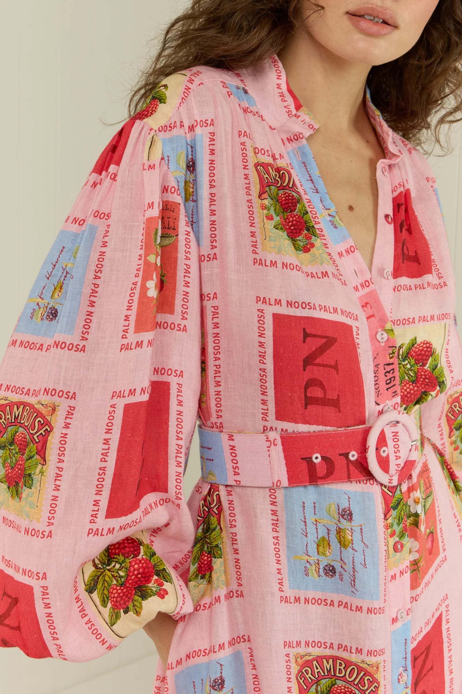 The Noddy Dress in our exclusive Strawberry Stamp print is crafted in 100% Premium Linen. The Noddy Dress is designed as a relaxed midi dress silhouette. Featuring blouson sleeves with elasticated cuffs, stand collar and centre front buttons. The Noddy Dress is designed to hang loosely from the body, and has matching buckle belt to bring in the waist. Please refer to our size and fit guide for further fit details.