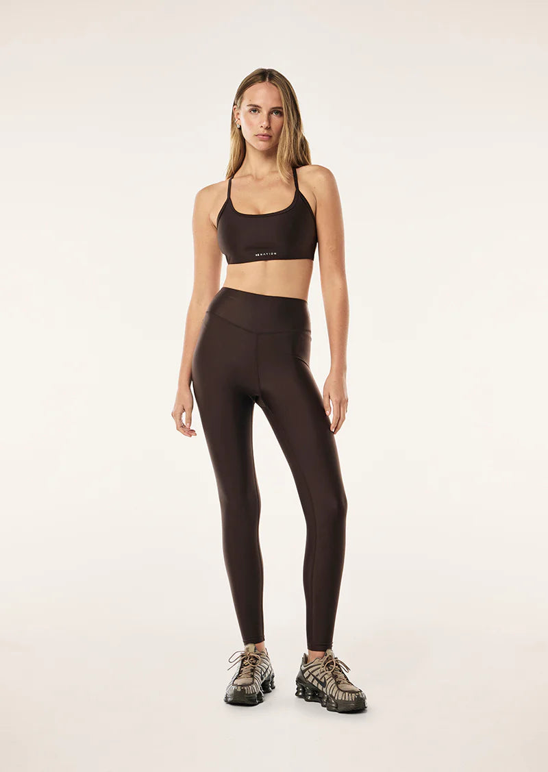 The Fairmont Legging in Espresso is made from our signature PWR Shine fabrication. This legging is ideal for medium to high intensity activity. An essential to your activewear wardrobe, style this legging with the matching Fairmont Sports Bra to complete the set.