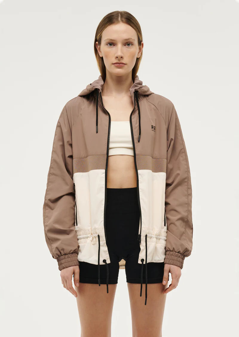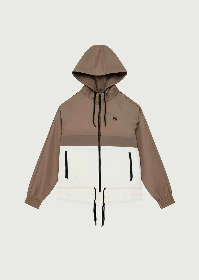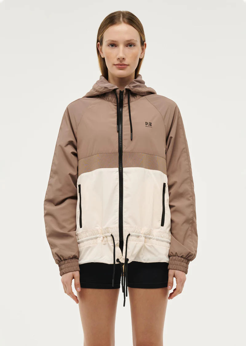 The Man Down Jacket in Taupe comes as part of our RE/CREATION Collection. Made from our signature water resistant spray fabric, this best selling style features contrast panelling on the body, zip up pockets and a drawcord waist and neckline. Perfect for layering, wear this wardrobe staple with activewear for the ultimate P.E Nation athleisure look.