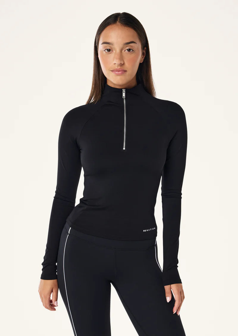 The Routine Quarter Zip Long Sleeve Top in Black is part of our FUTURE MODERN Collection, designed for movement and effortless style. Crafted from our ultra-soft Studio Soft fabrication, this fitted active top features a sleek quarter-zip front, raglan sleeves, and a high collar for a refined, sporty aesthetic. Versatile and elevated, it's perfect for layering over activewear or pairing with your favorite pants for a dynamic all-day look.