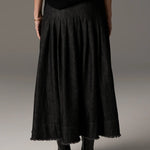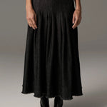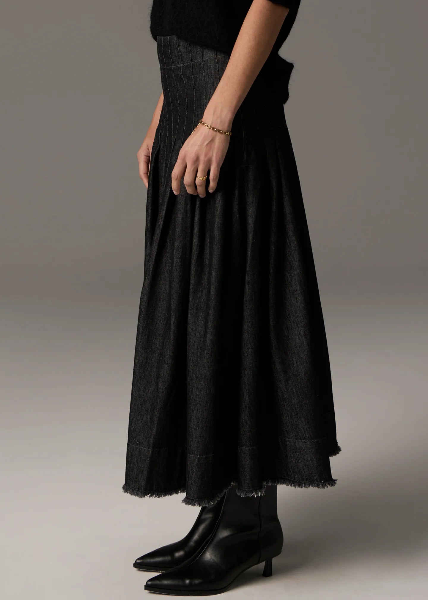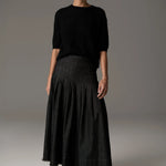 -Stitched down knife pleat detail over the hips, flaring out into a full silhouette.