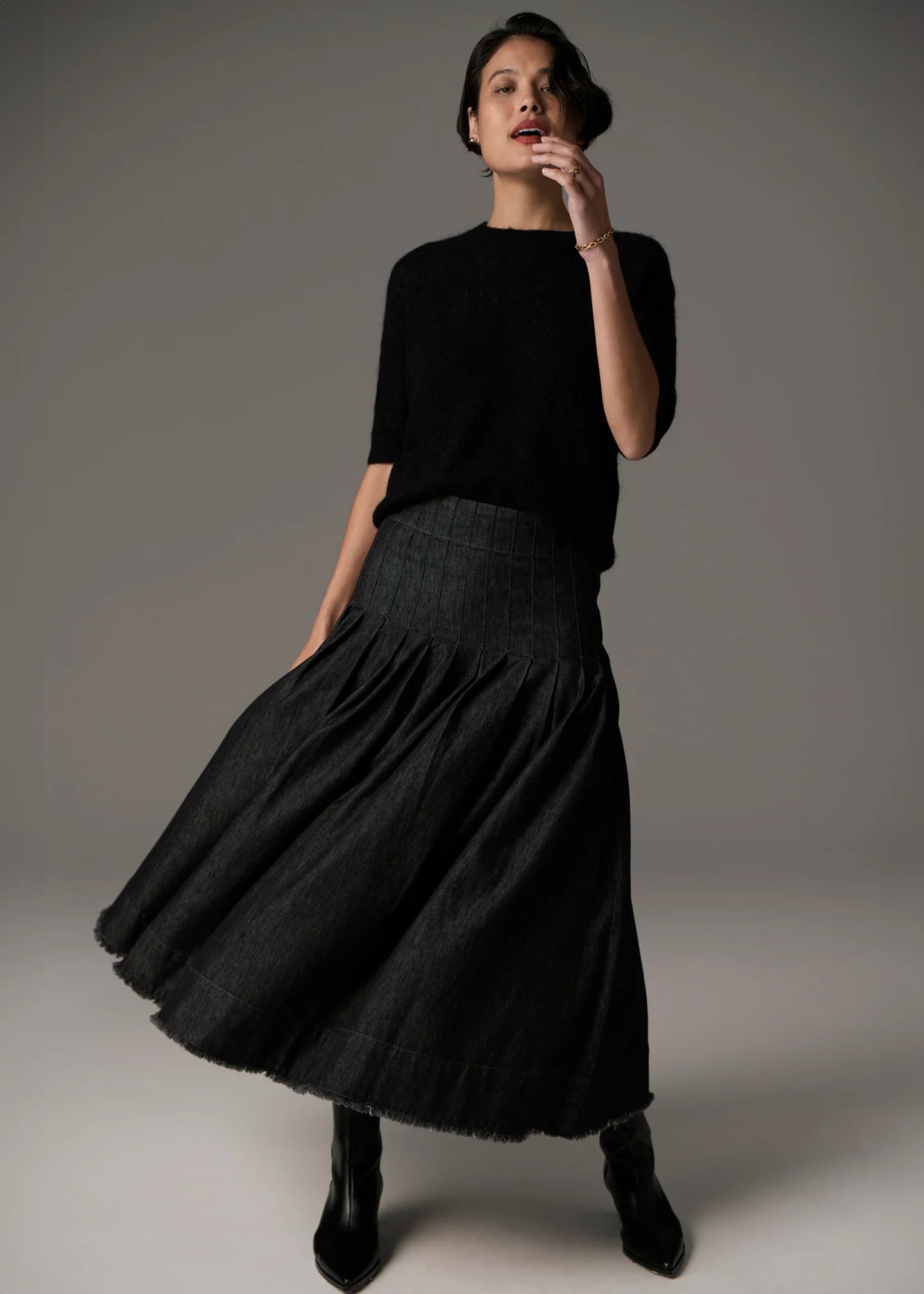 The Reece Denim Skirt features pleated detailing over the hips for a fit and flare silhouette that creates an elevated take on a wardrobe classic.