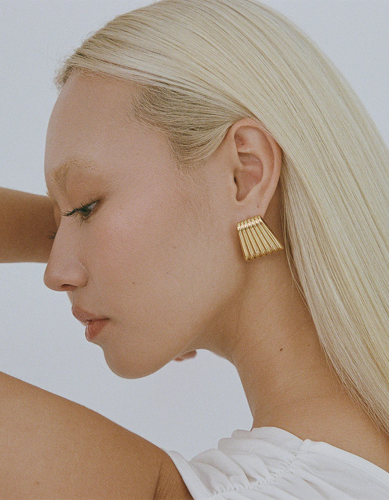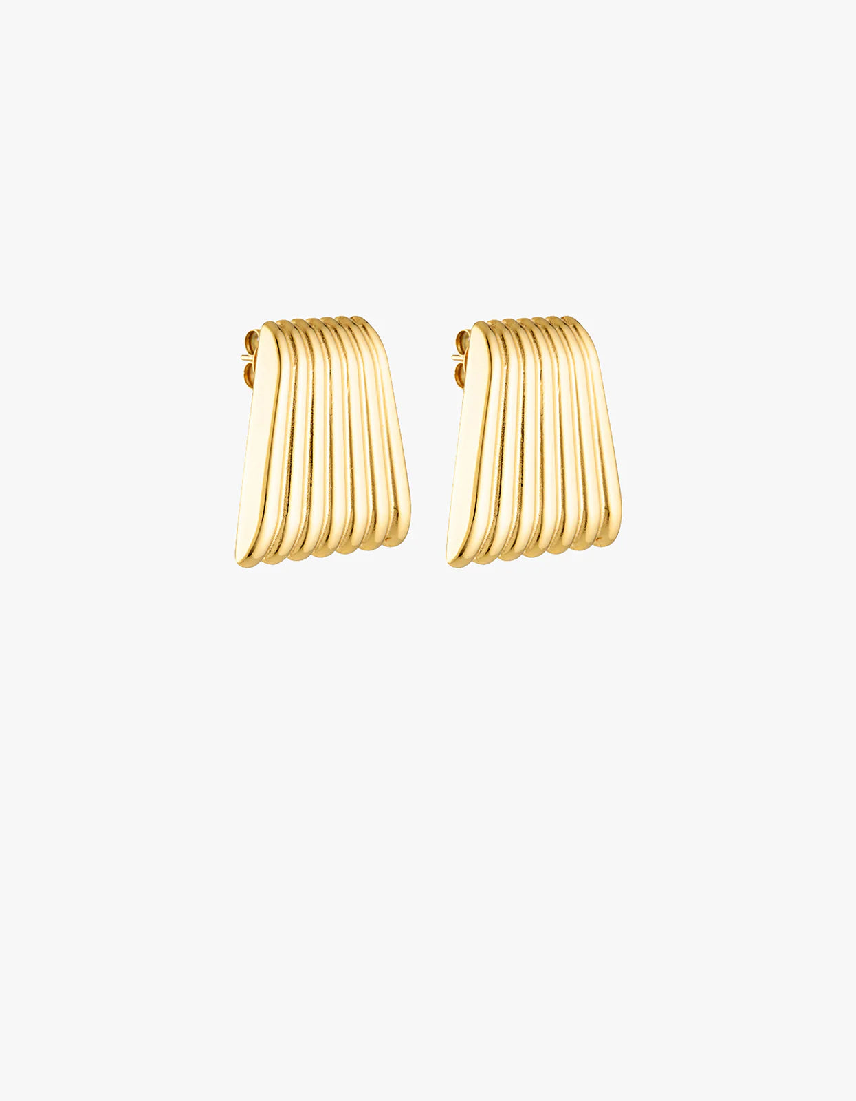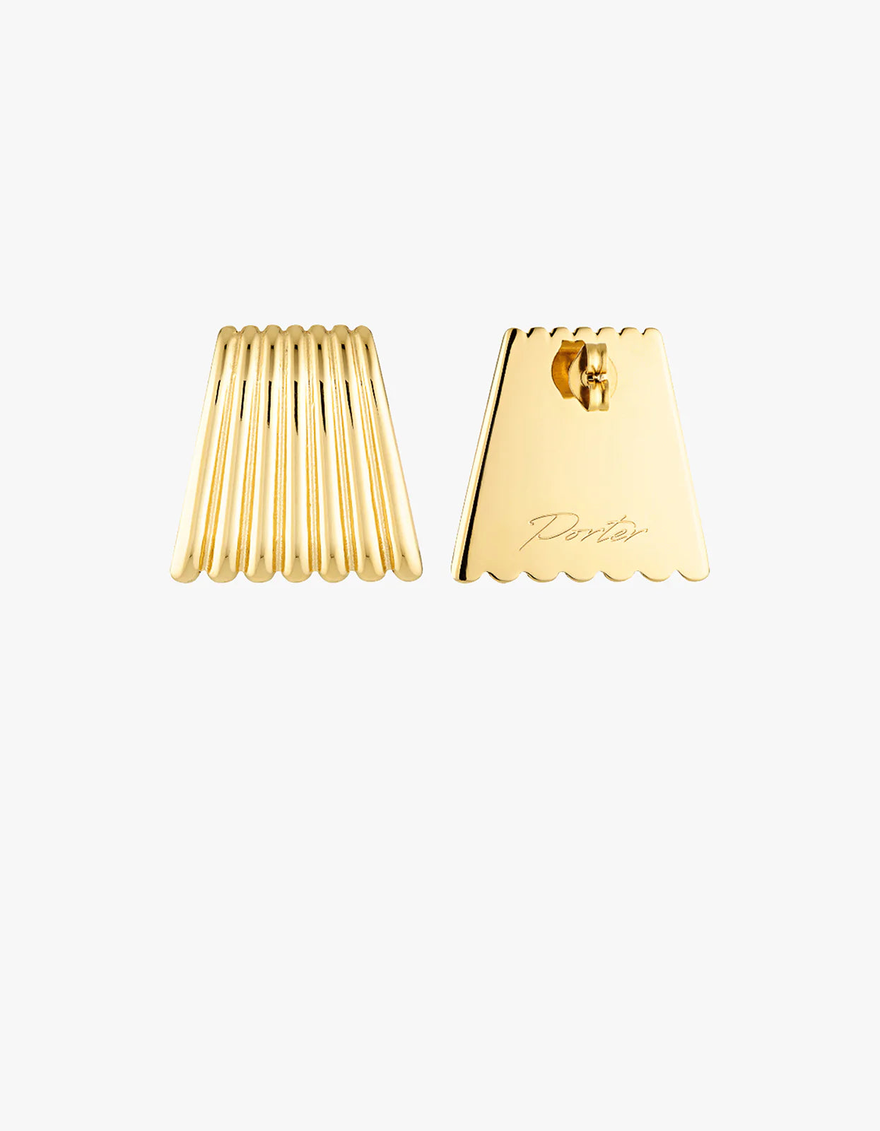 Complete your look with these elegant Caterpillar Earrings in gold from Porter. The grooved design adds a touch of sophistication to any outfit. Perfect for any occasion, these earrings will bring some playful charm to your wardrobe. Elevate your style with these unique and eye-catching earrings.