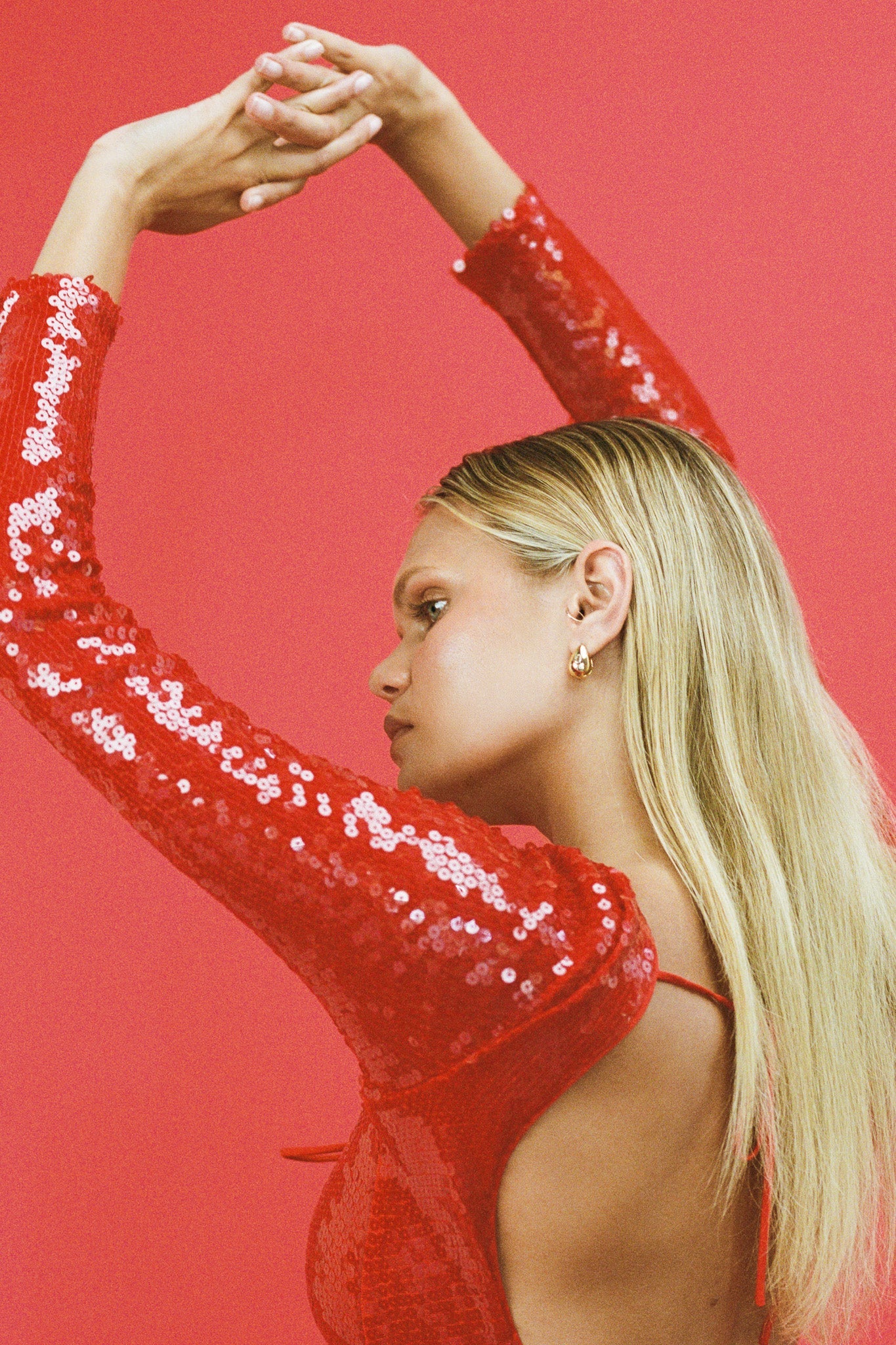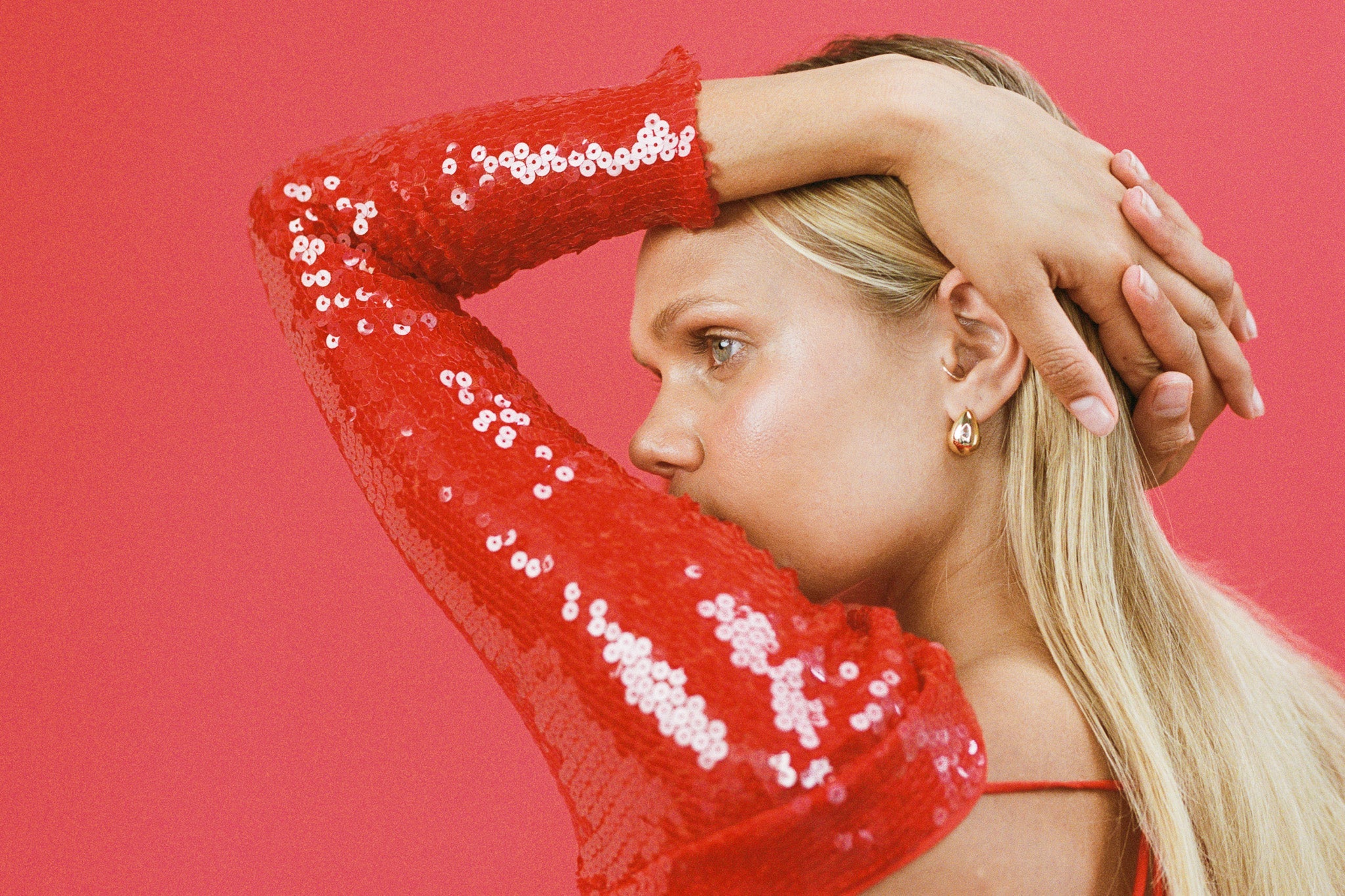 18k gold vermeil with a sterling silver base. All our pieces are water-resistant, will never rust or turn green, and can be worn in the shower.