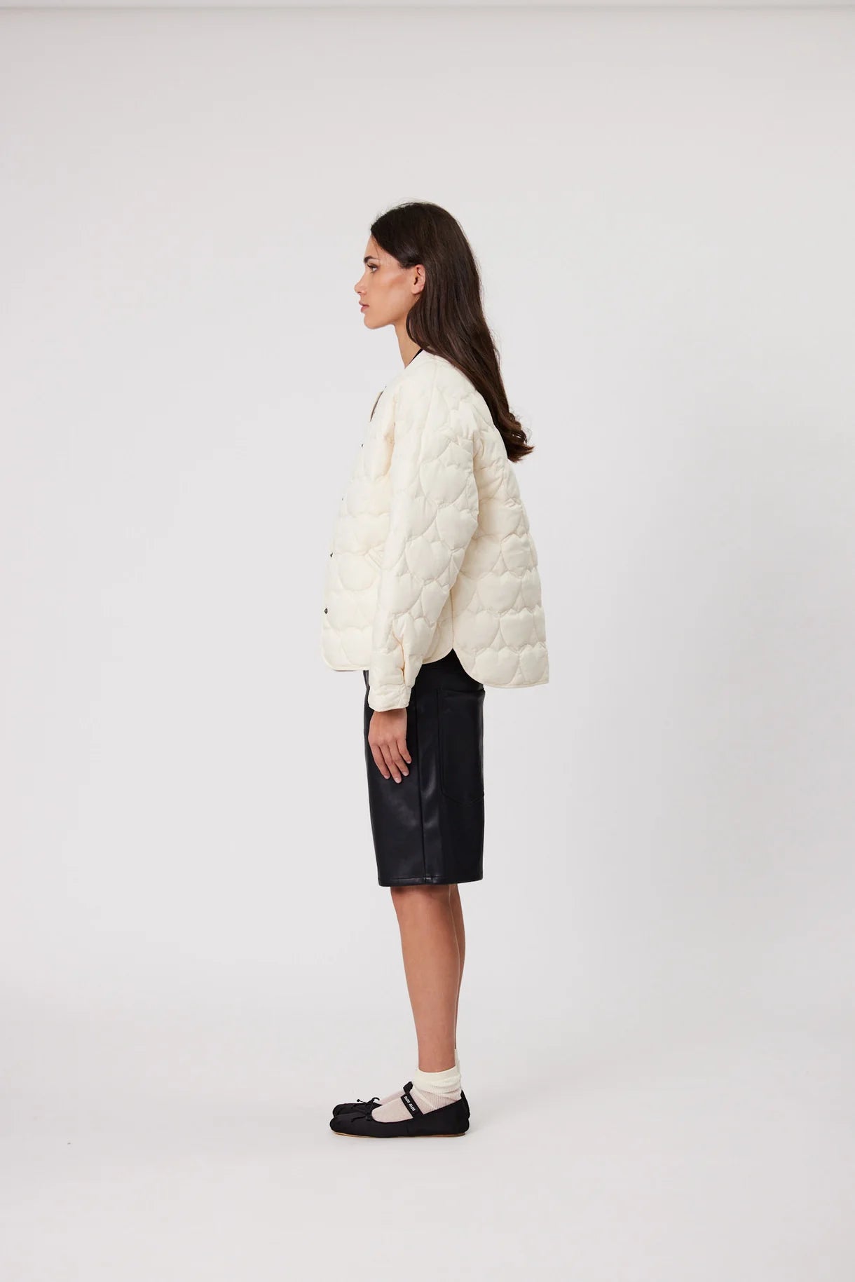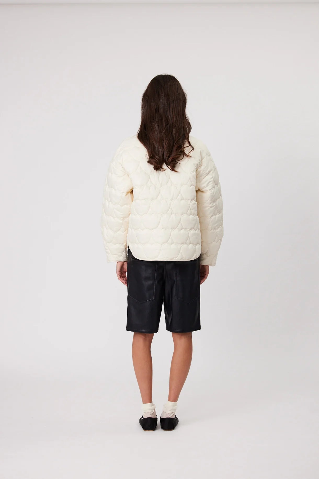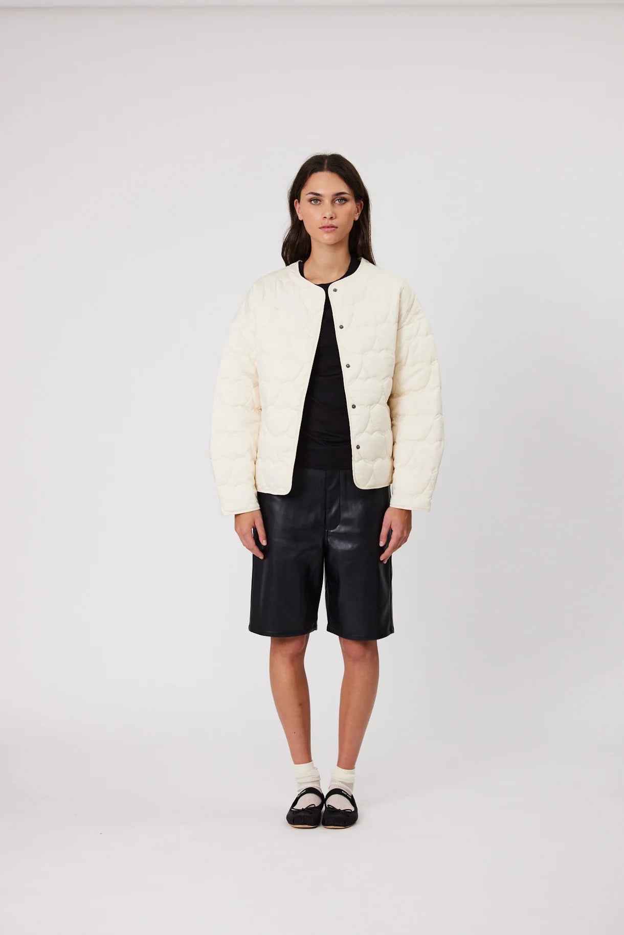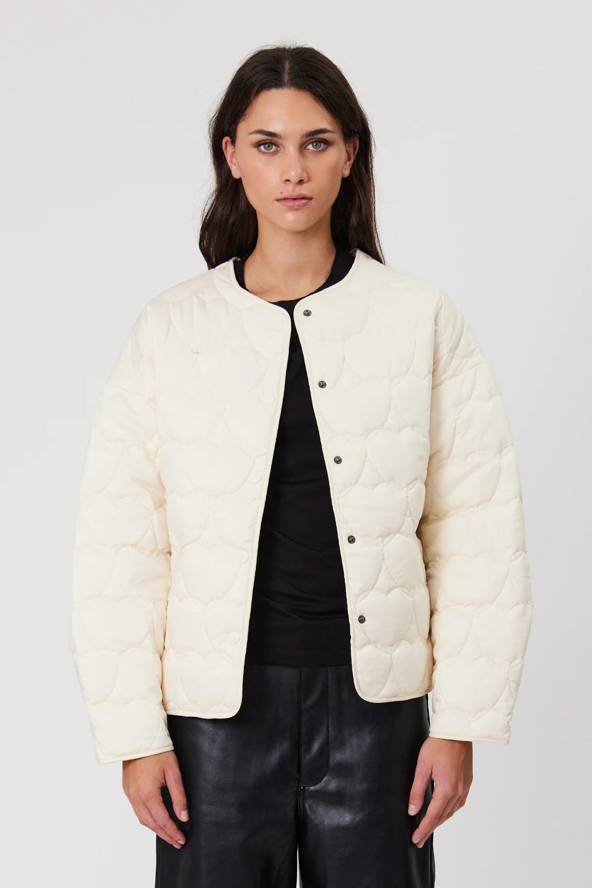 The Ava Jacket comes in a modern collarless silhouette, quilted with heart shaped lines. Cut in a relaxed fit with dropped shoulders and finished with a snap closure front and bound edges.
