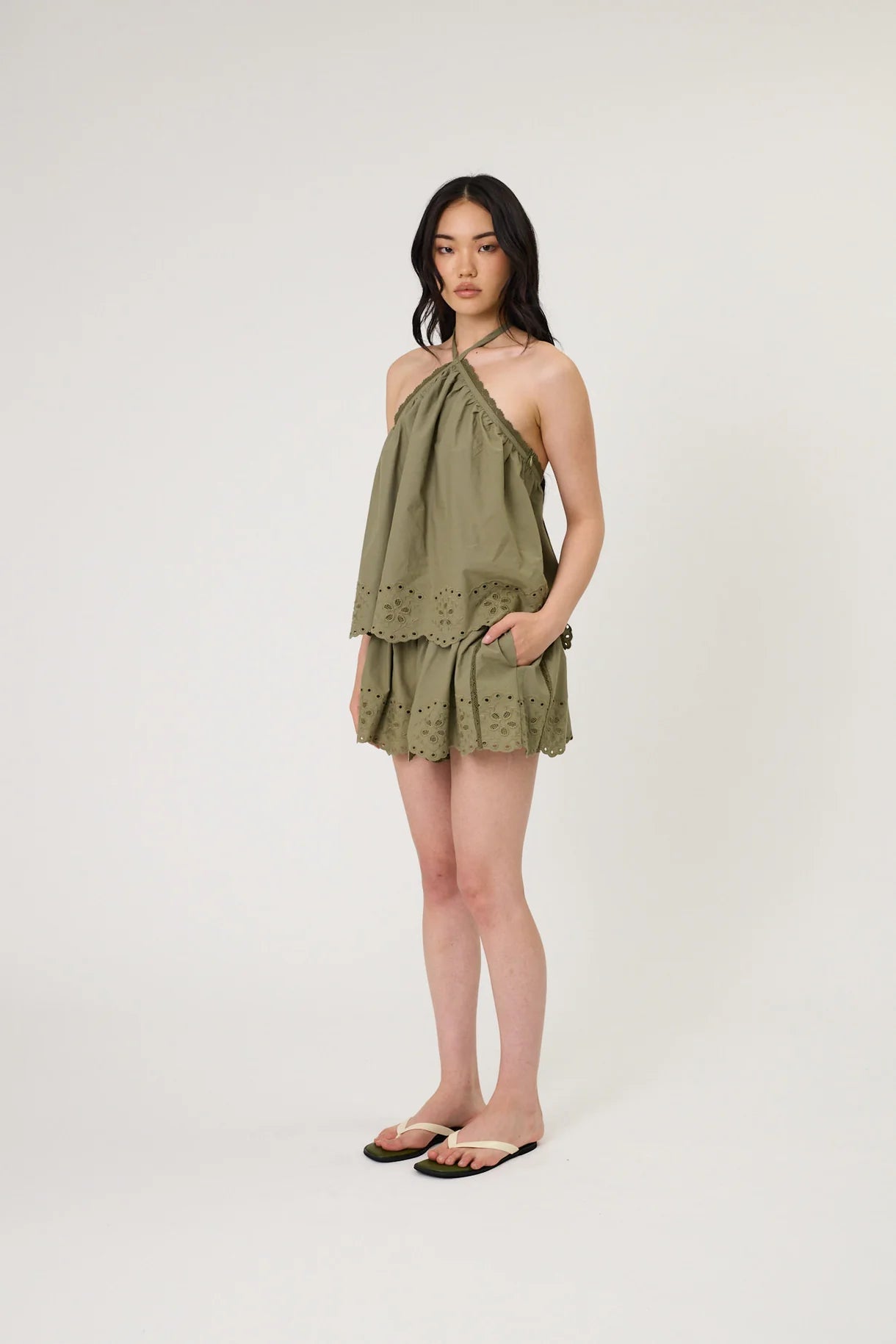 The Bella Shorts are constructed with a scallop broderie hem for a feminine touch. Made from 100% cotton, light, breathable and fit for lounging, or paired with the a classic tank for an effortless summer look. Also available in Cloud.