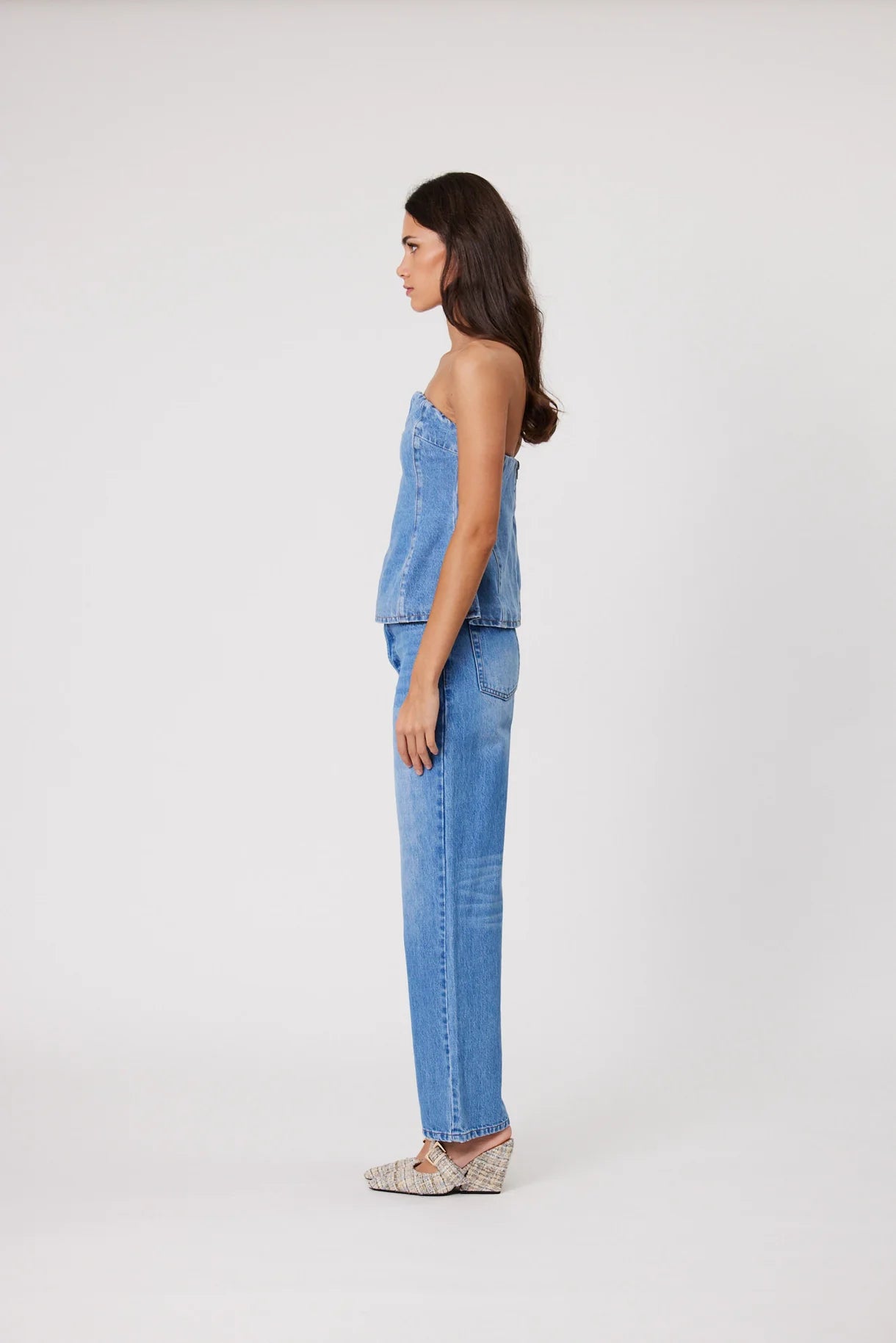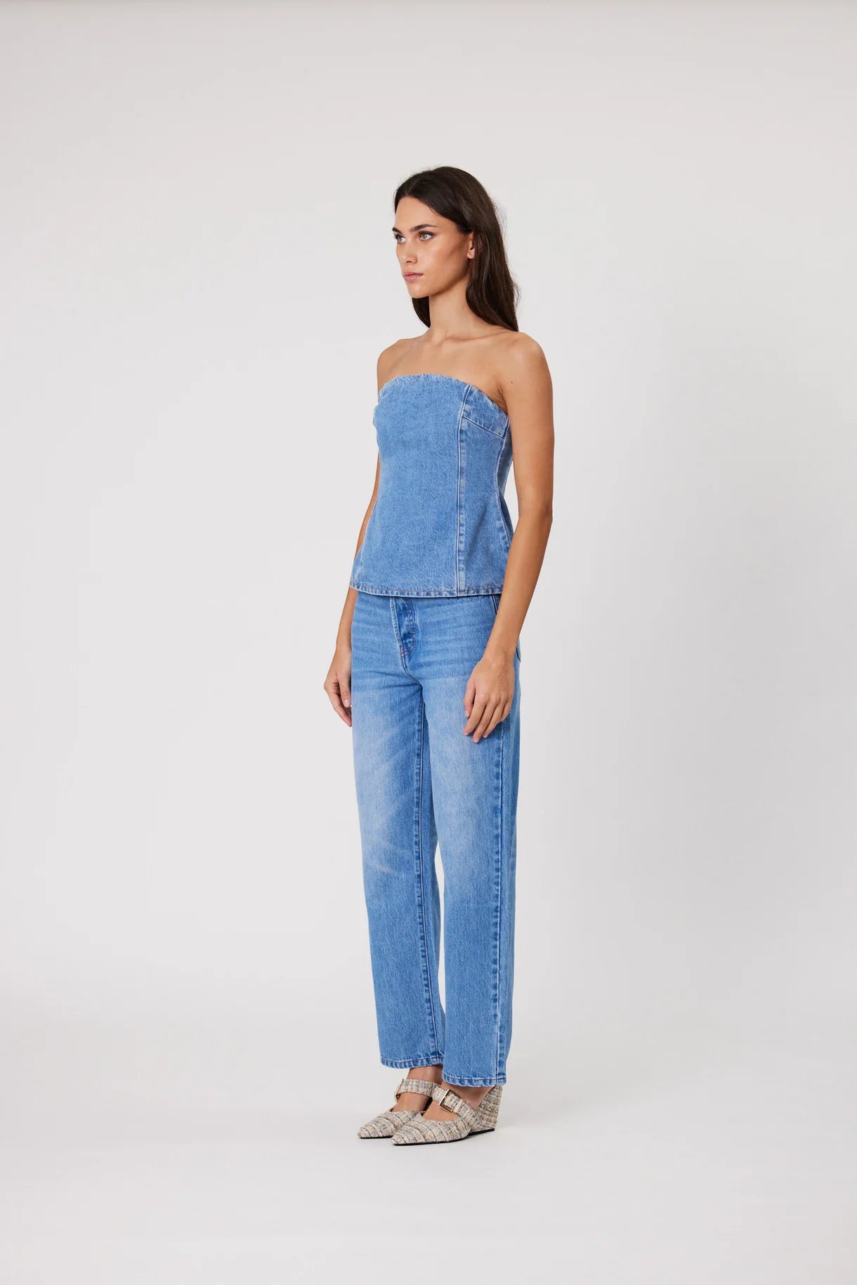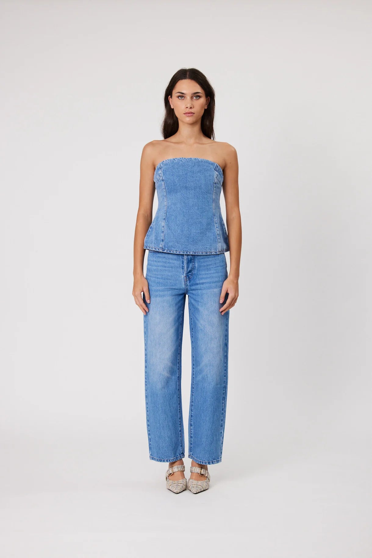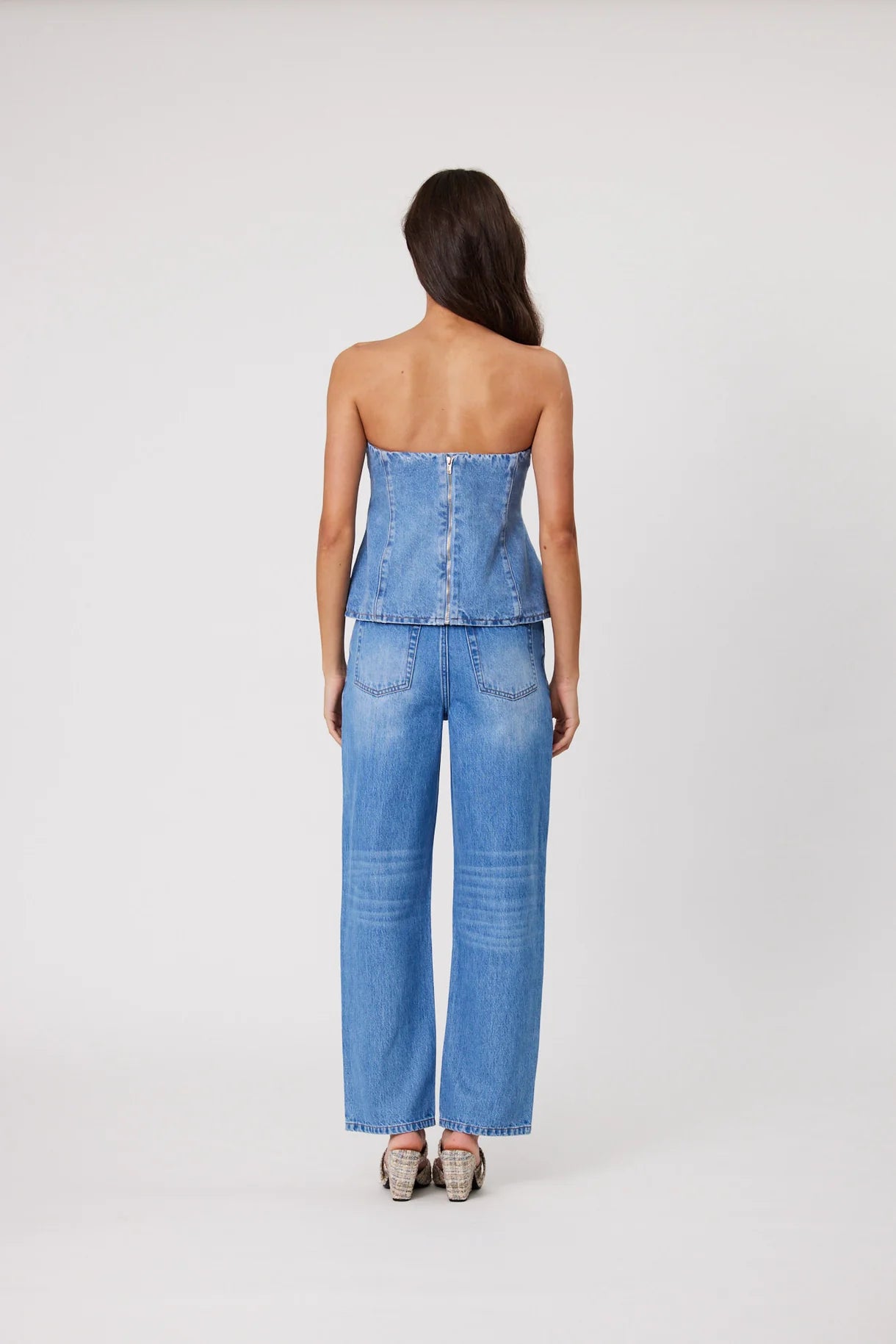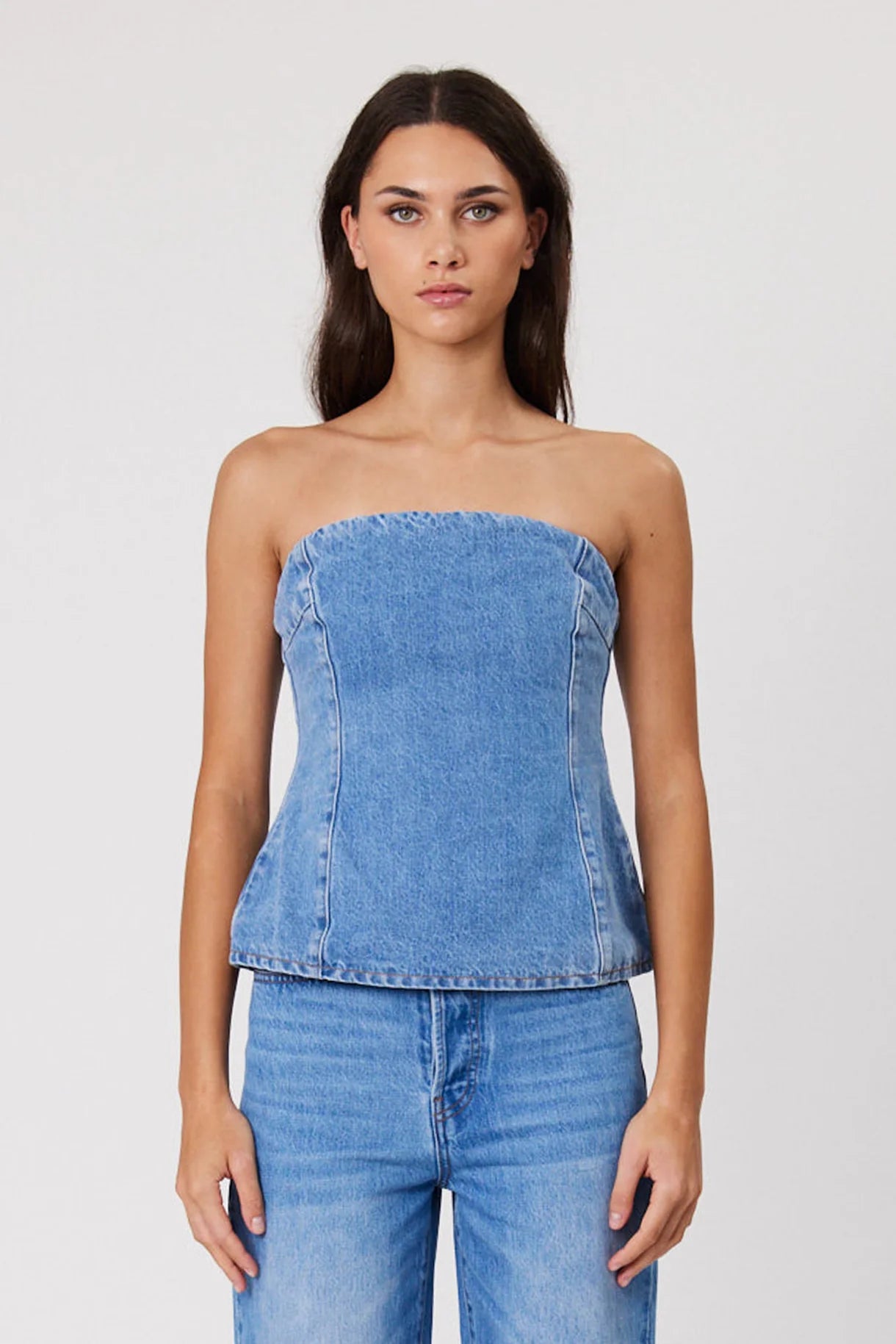A strapless bodice with a metal back zip closure. Fitted across the chest and flaring out at the hem to create the illusion of a cinched waist. Made in denim for that everyday polished look.
