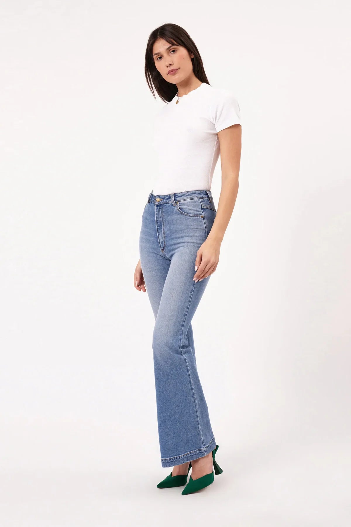 This is a high-rise, flare leg jean, made with a premium stretch denim. Fits true to size.