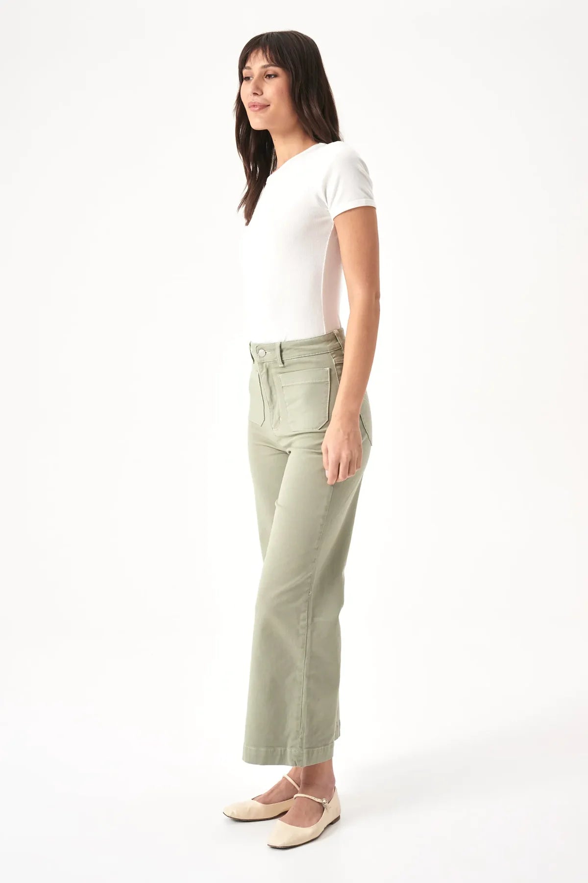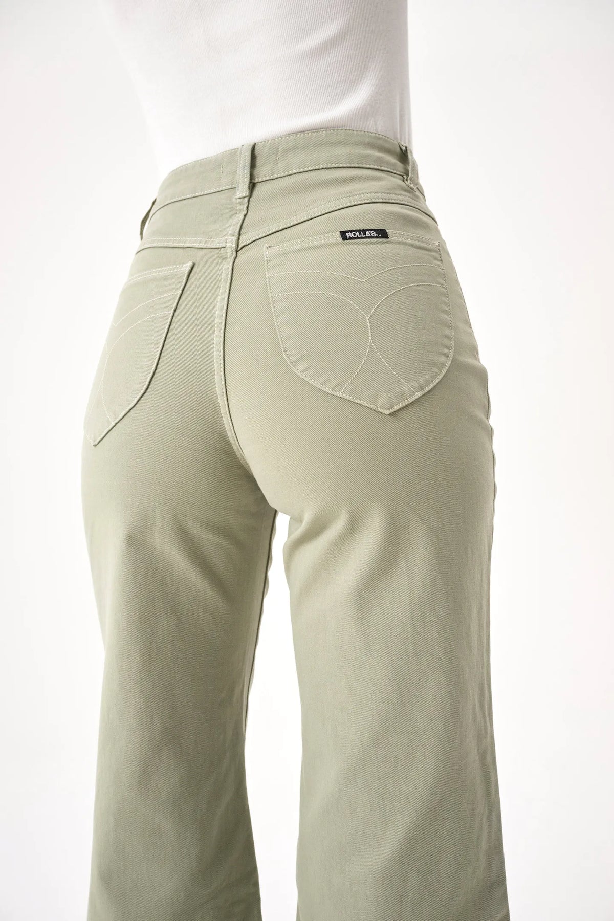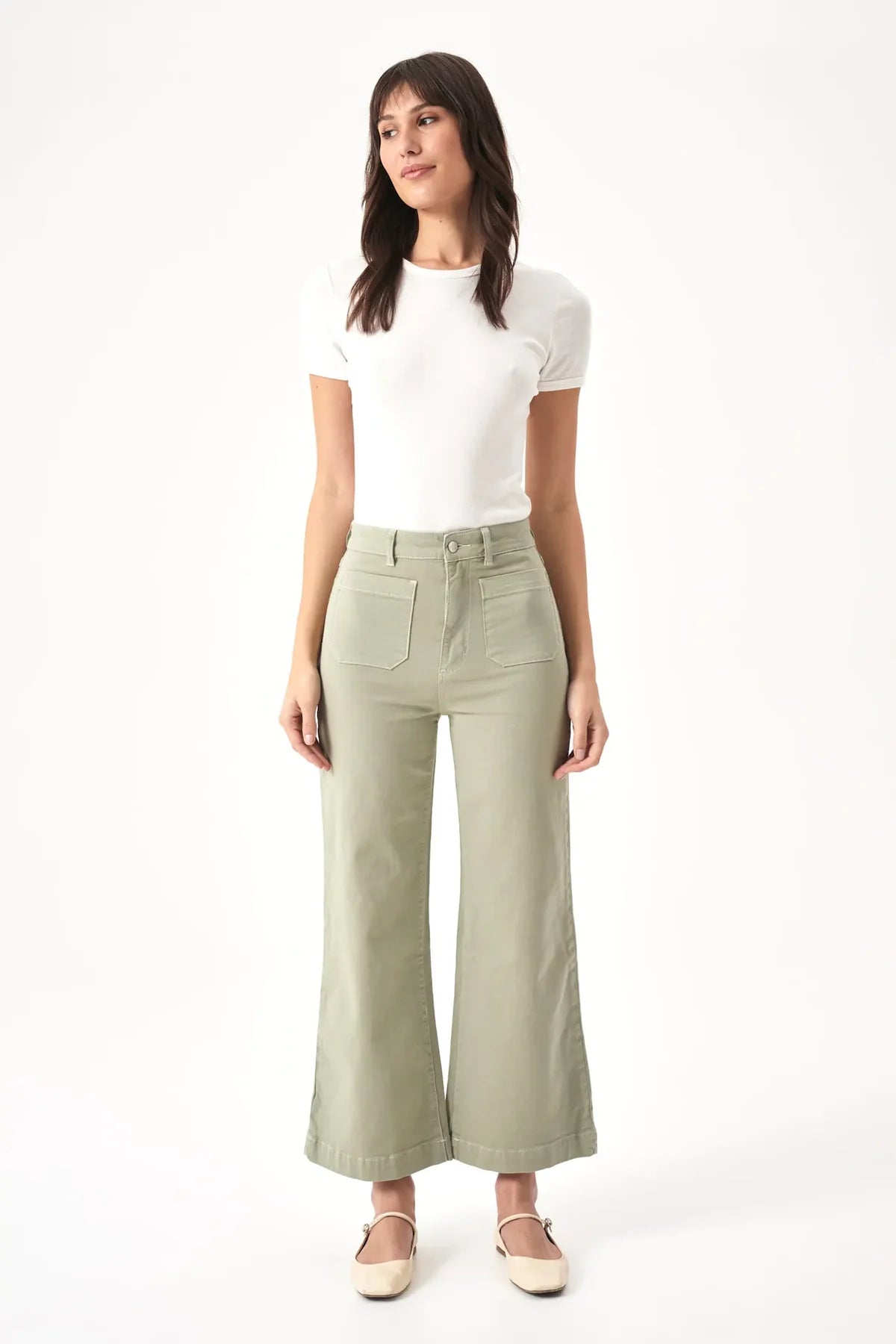 The Sailor Jean in Khaki is a super high-rise, wide leg jean, made with a stretch drill denim. Fits true to size.