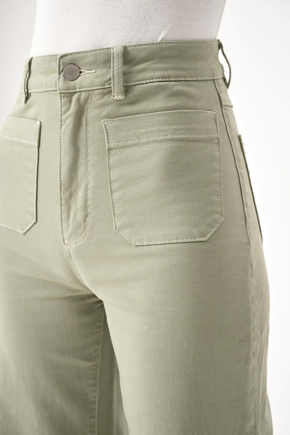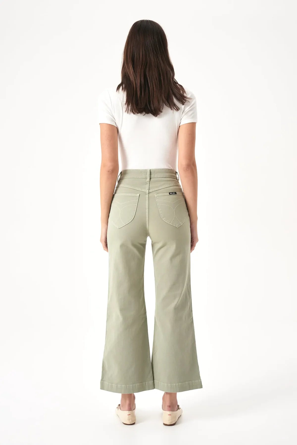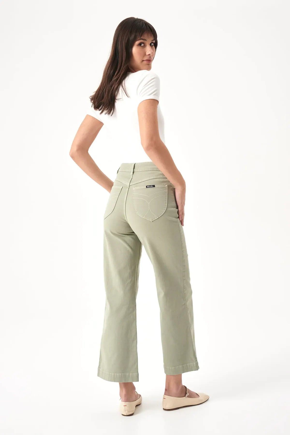 The Sailor Jean in Khaki is a super high-rise, wide leg jean, made with a stretch drill denim. Fits true to size.