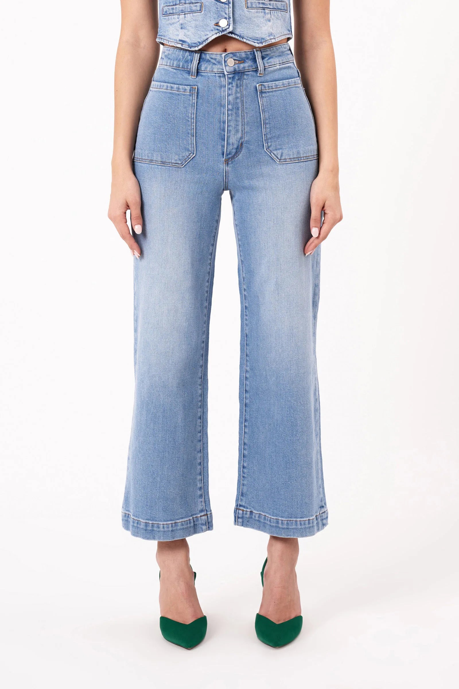 This is a super high-rise, wide leg jean, made with a super stretch denim. Fits true to size.