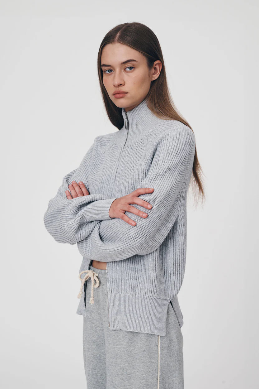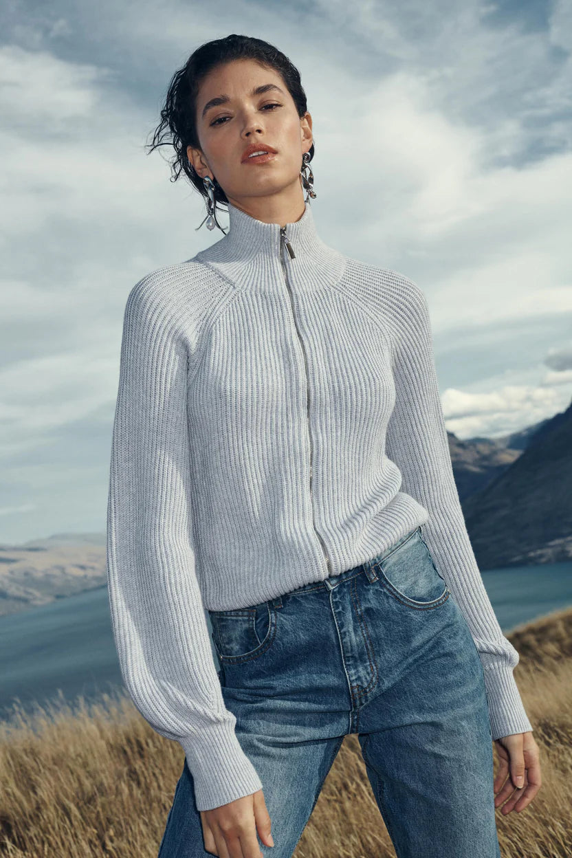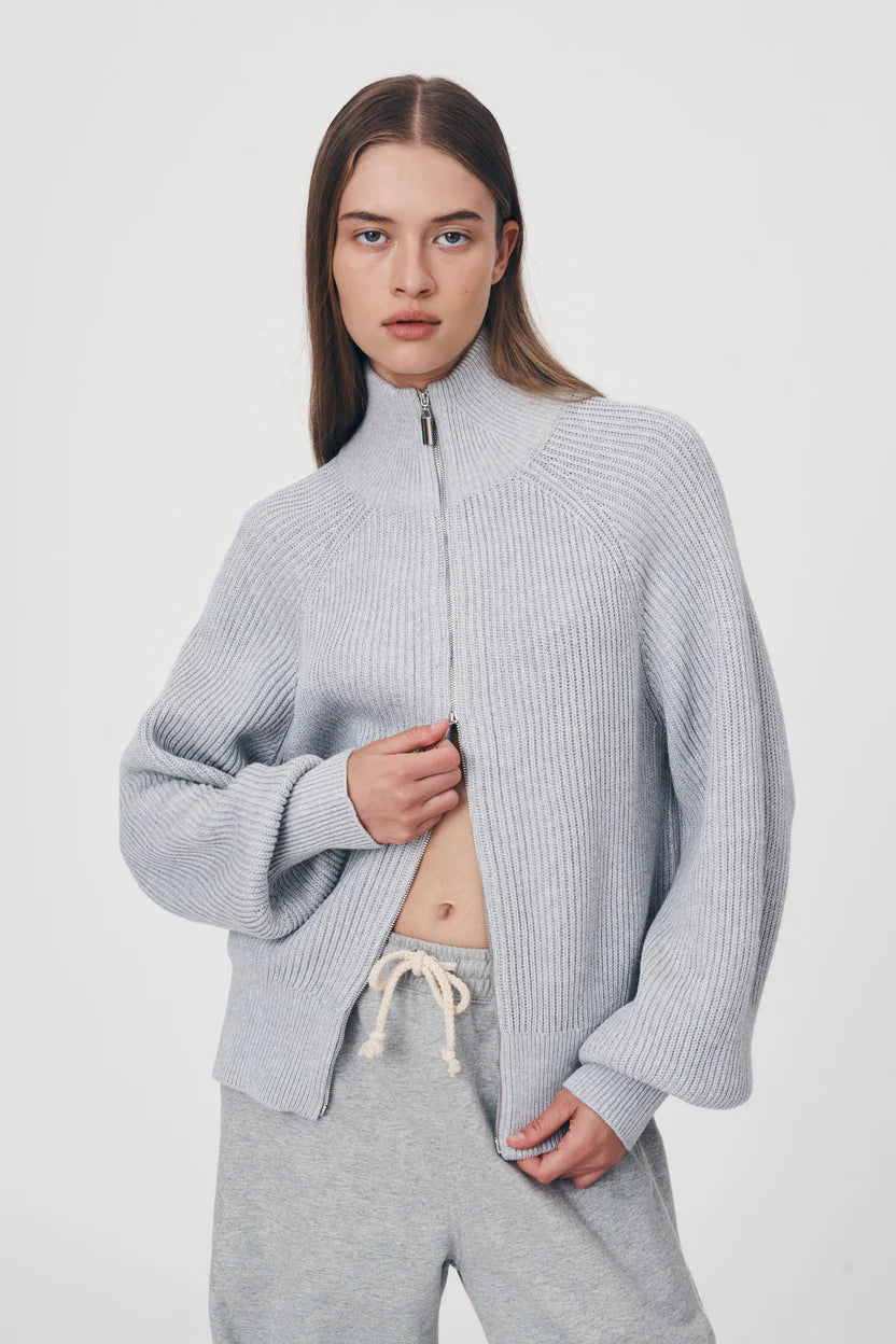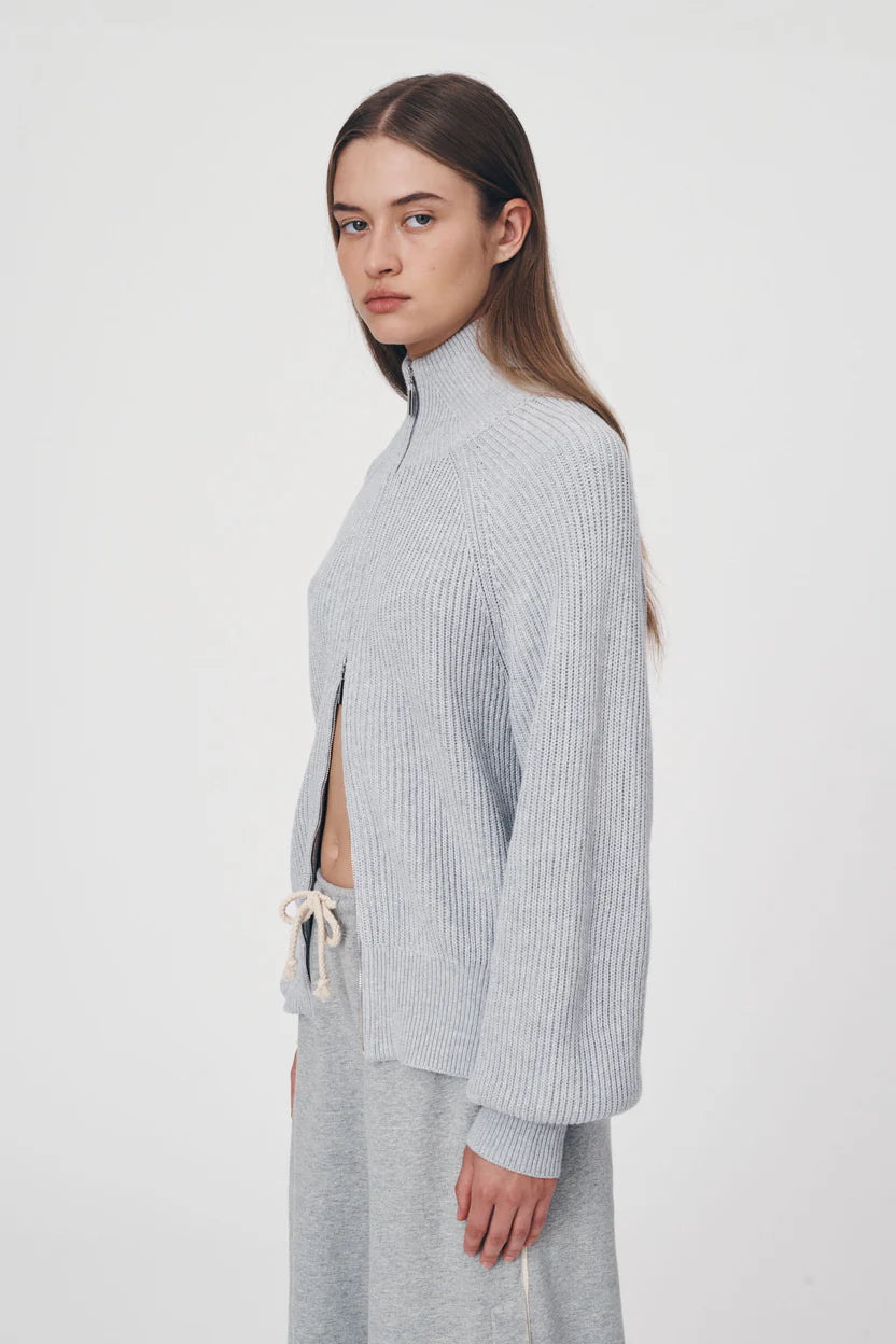 Introducing our Banjo Zip Knit Cardigan, a must-have for every closet. Meticulously crafted from zero-waste cotton knit, it provides style and comfort. In a timeless Grey Marle hue, its relaxed fit and cozy balloon sleeves elevate any ensemble. Complete with a convenient 2-way zip closure and rib knit detail throughout, it's the perfect layering piece