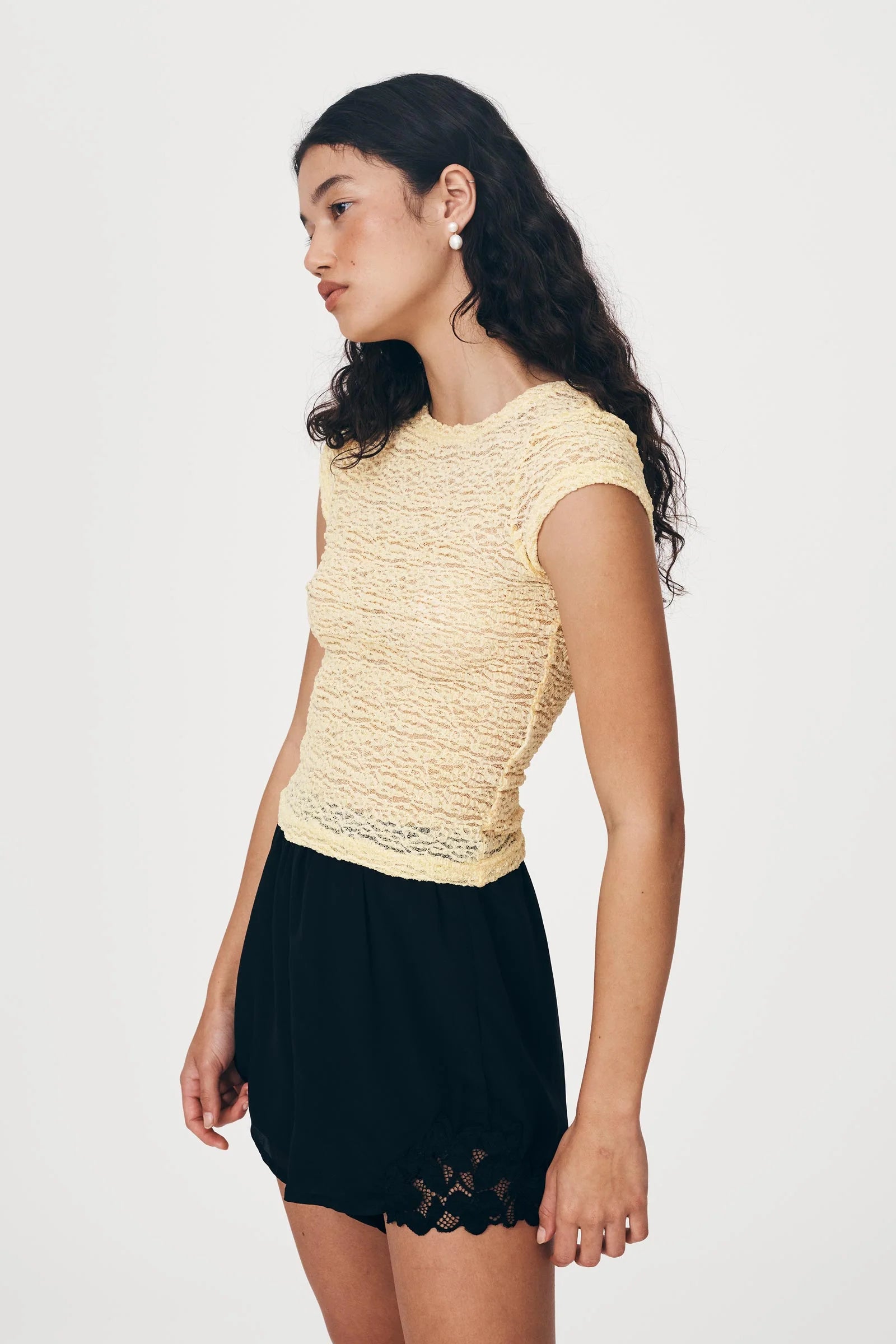 Sheer sophistication - the Galo Lace Tee in Lemon is a best-selling classic reimagined for the season. Its stretch lace, cap sleeves, and boat neckline make it a perfect pairing with the Mina Silk Mini Skirt for effortless summer styling.