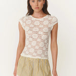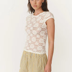 The Galo Tee in Creme. A fitted baby tee in semi-sheer sunflower lace, finished with cap sleeves and a boat neckline. An icon, reissued.