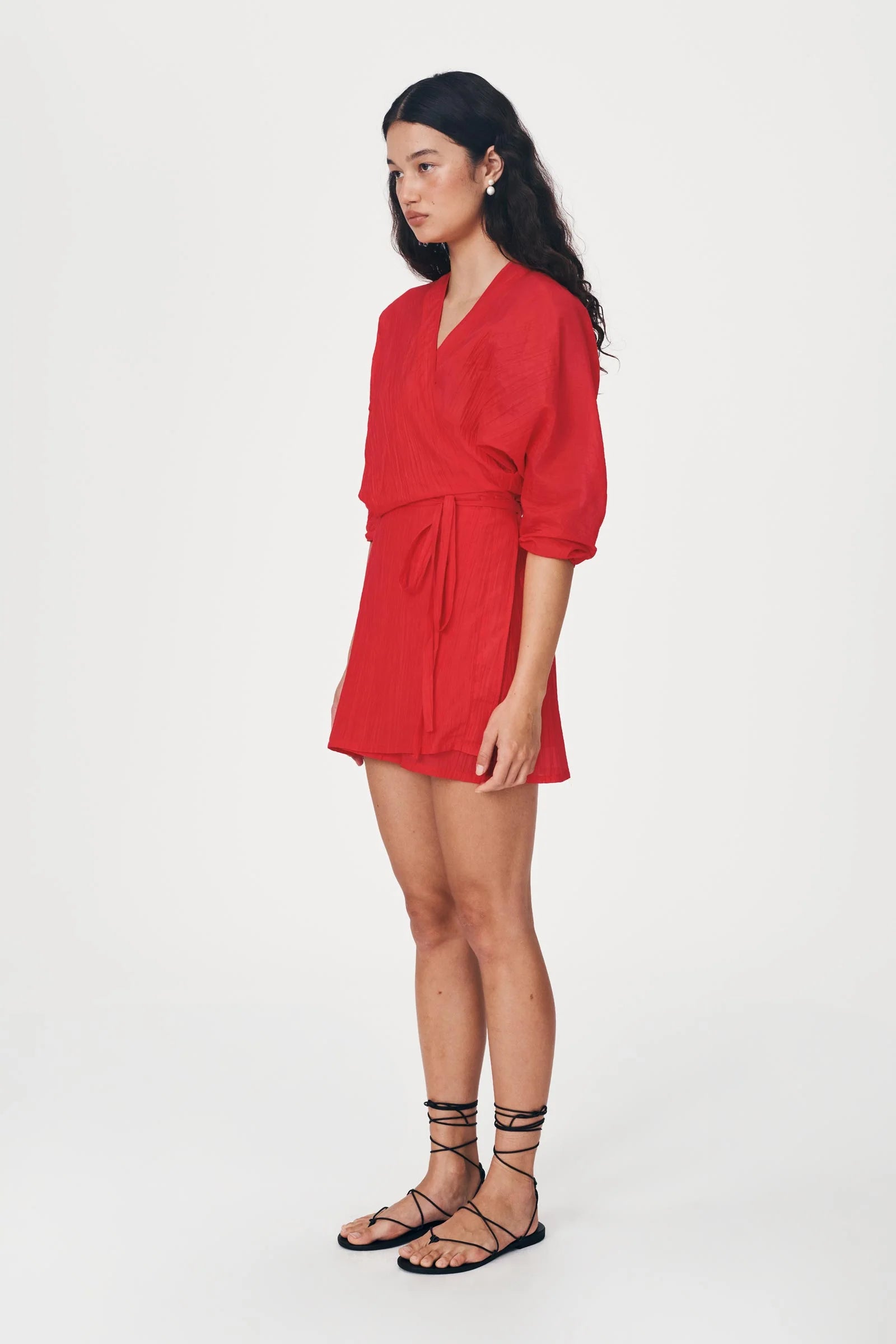 Make an entrance in the Isla Silk Wrap Mini Dress in True Red. With its luxe silk-cotton blend, draped batwing sleeves, and flattering wrap design, it’s a timeless choice for festive celebrations.