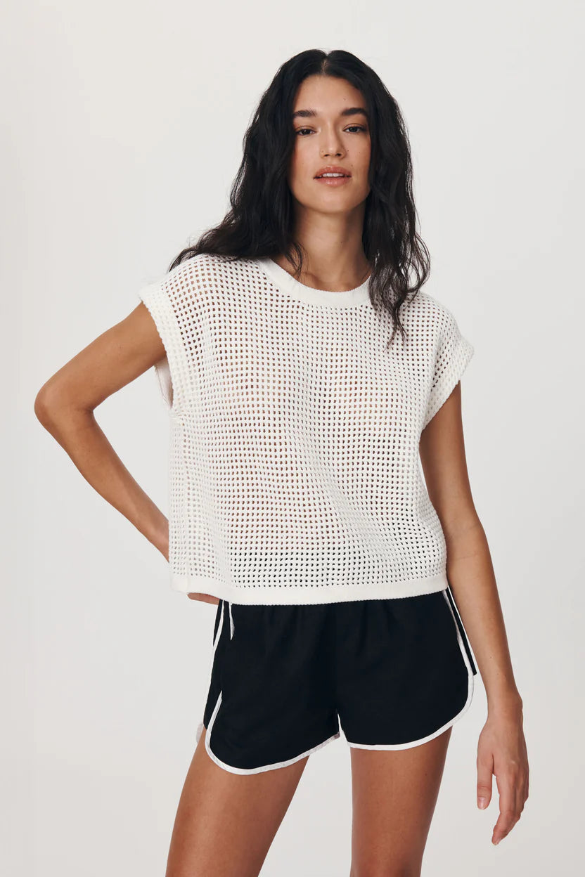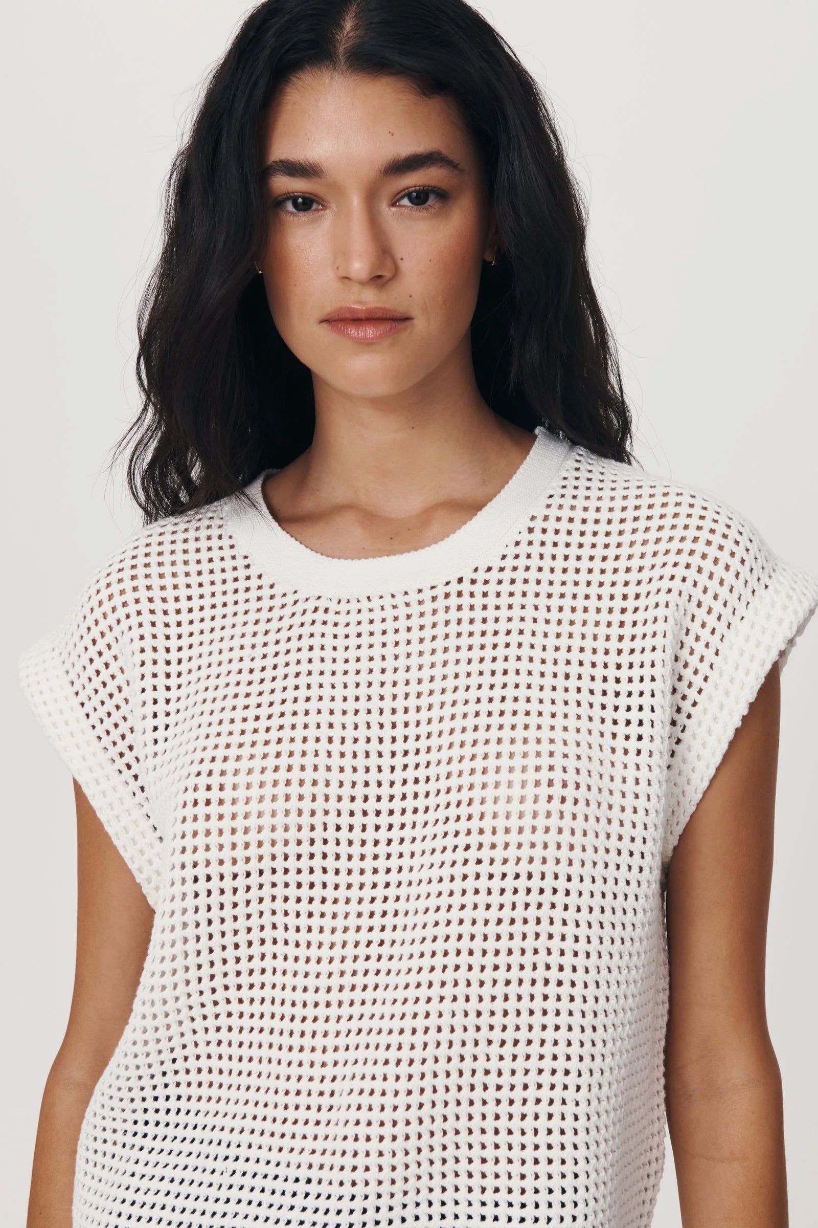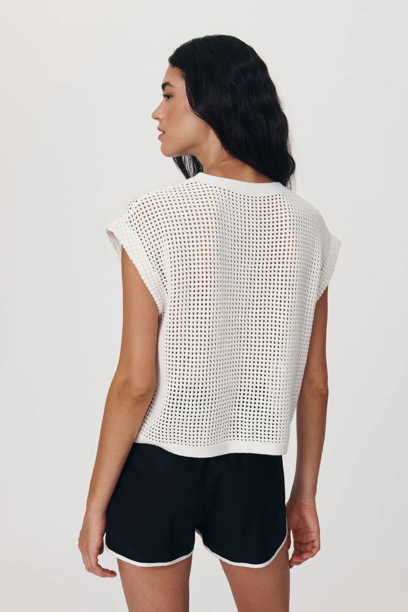 A staple layering piece, the Mimi Knit Top is a versatile addition to your wardrobe. Embrace its relaxed, contemporary allure with its boxy fit and open-knit detailing. Effortlessly combine with the Rocco Stripe Pants or Minimal Denim Jeans, or throw over swimwear for a relaxed beach-to-bar look.