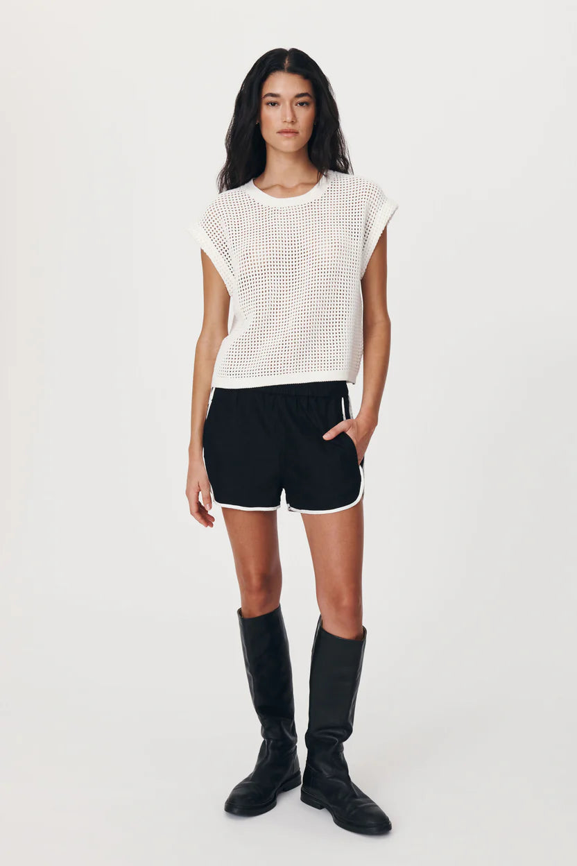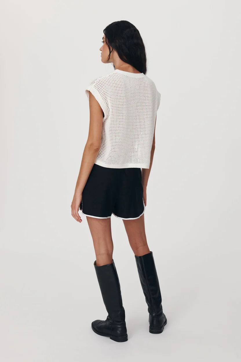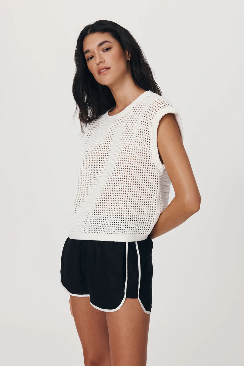 A staple layering piece, the Mimi Knit Top is a versatile addition to your wardrobe. Embrace its relaxed, contemporary allure with its boxy fit and open-knit detailing. Effortlessly combine with the Rocco Stripe Pants or Minimal Denim Jeans, or throw over swimwear for a relaxed beach-to-bar look.