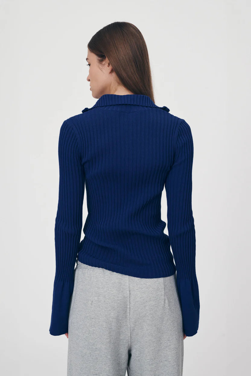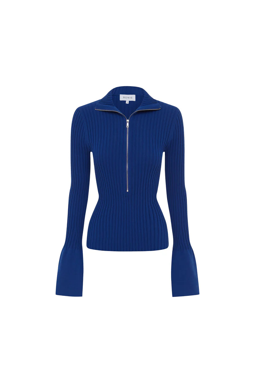 The Travis Zip Knit Jumper – a must-have addition to your wardrobe, now available in Cobalt Blue. Crafted from quality ribbed knit fabric with a zero-waste approach, it features a stylish half-zip mock neck with silver hardware and modern bell sleeves. With a touch of elastane, it offers comfortable stretch for ease of movement, perfect for achieving a chic, relaxed look effortlessly.