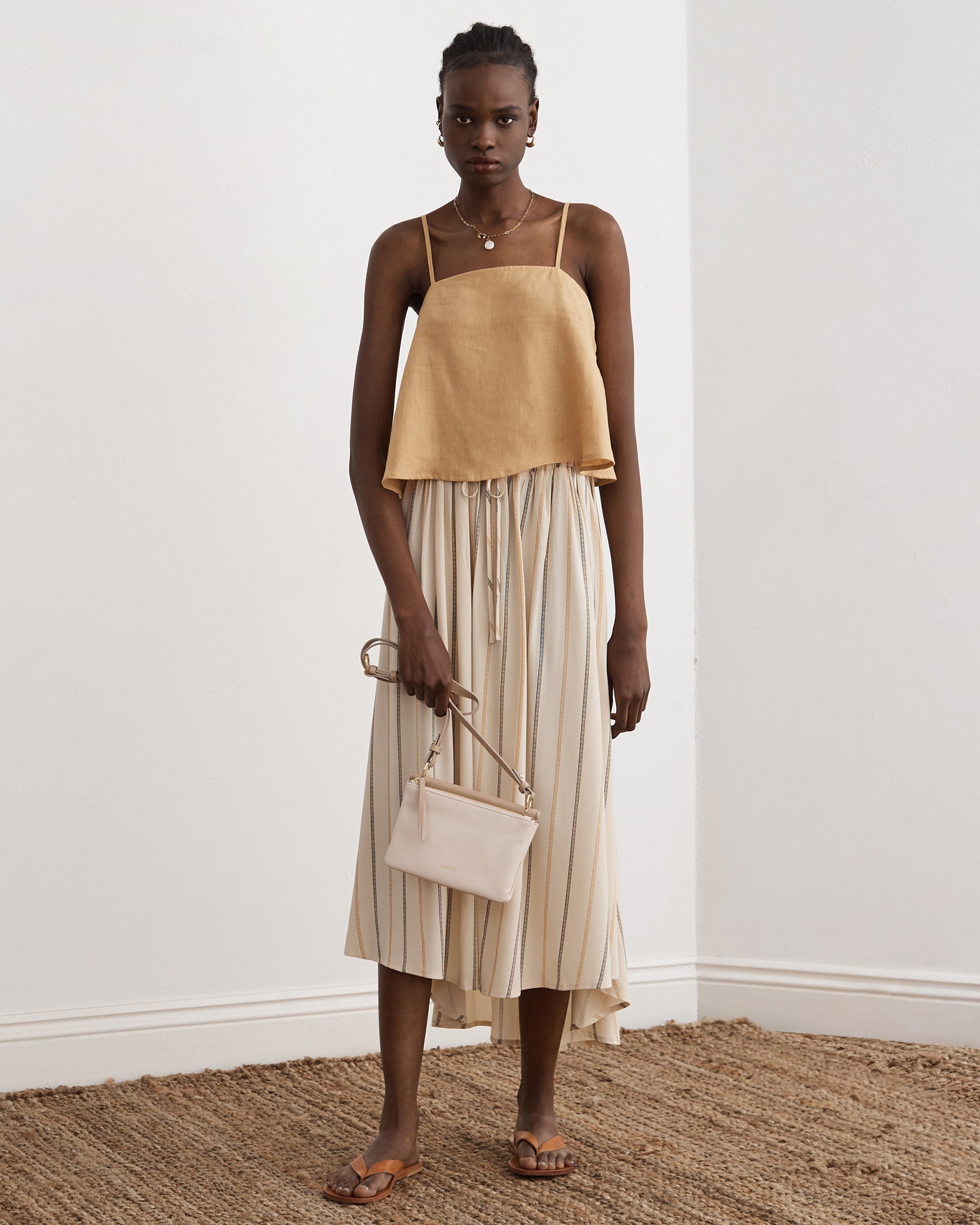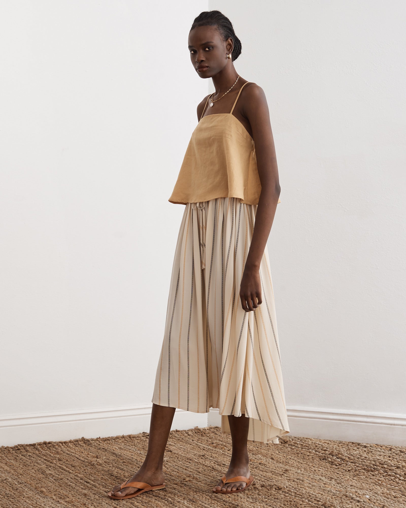 - Spaghetti straps with adjustable gold sliders