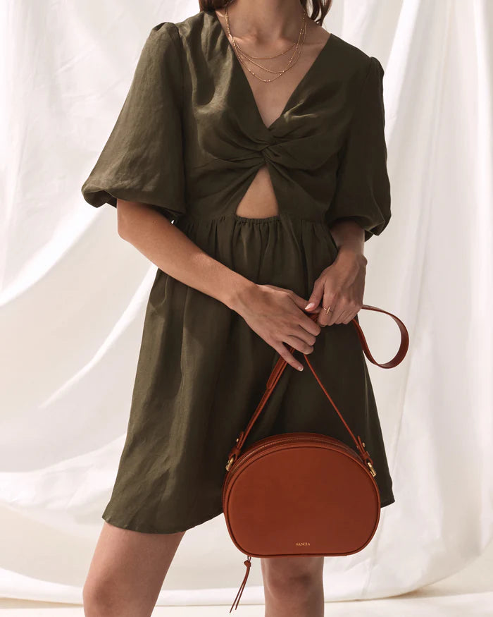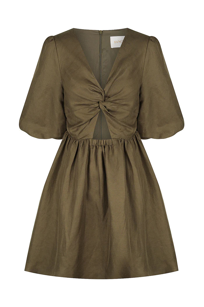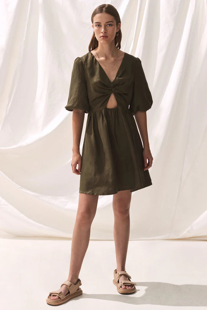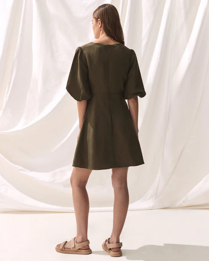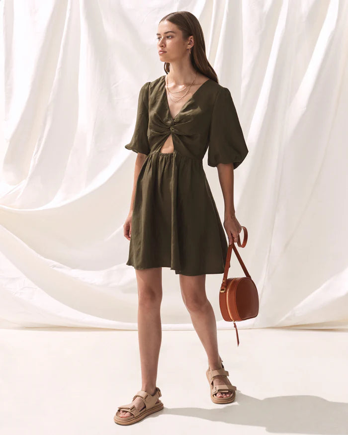 A sweet little mini dress number, the Bria Dress features twist front detail and mini cut out that is counter-balanced by a full and volumous elbow length sleeve. The mini skirt is loose and fluid for that perfect swish and the waistband is elasticised for an easy fit. Designed with those special moments in mind.
