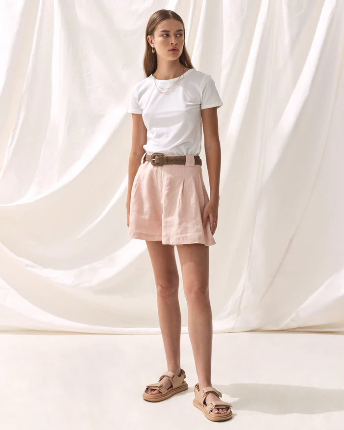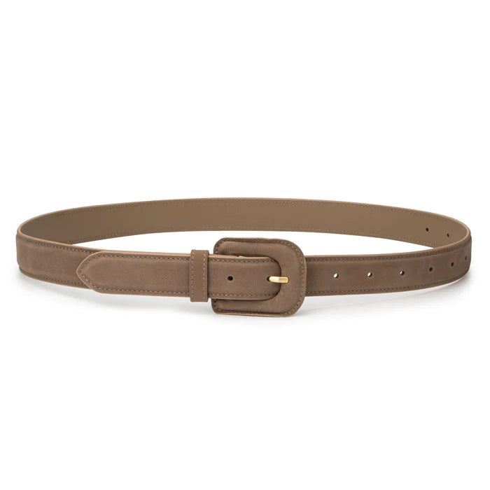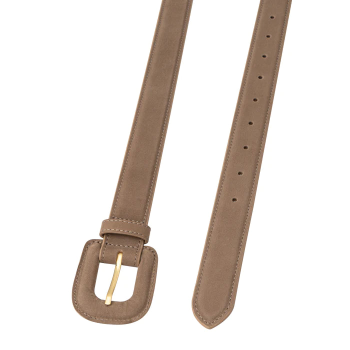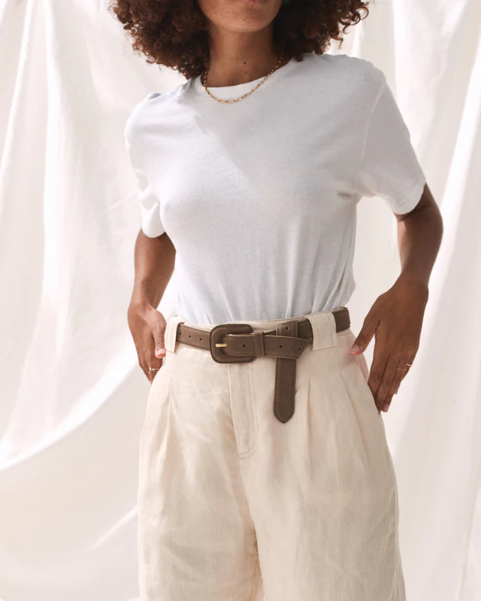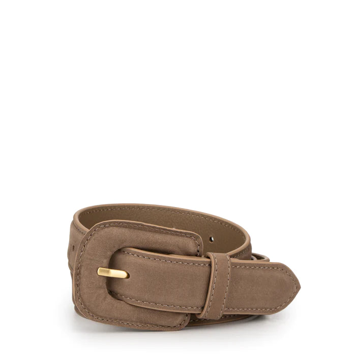 The Cindi Belt is a sophisticated use of suede leather and its wide width gives every outfit an instant lift and elevates it from the mundane. The beautifully soft suede is wrapped around a recycled metal buckle and the belt is finished with a classic top stitching detail. Backed with a full grain leather, it will wear beautifully on any fabrication. Use it to cinch in the waist of your fluid dresses or thread it through the loops of pants or jeans.