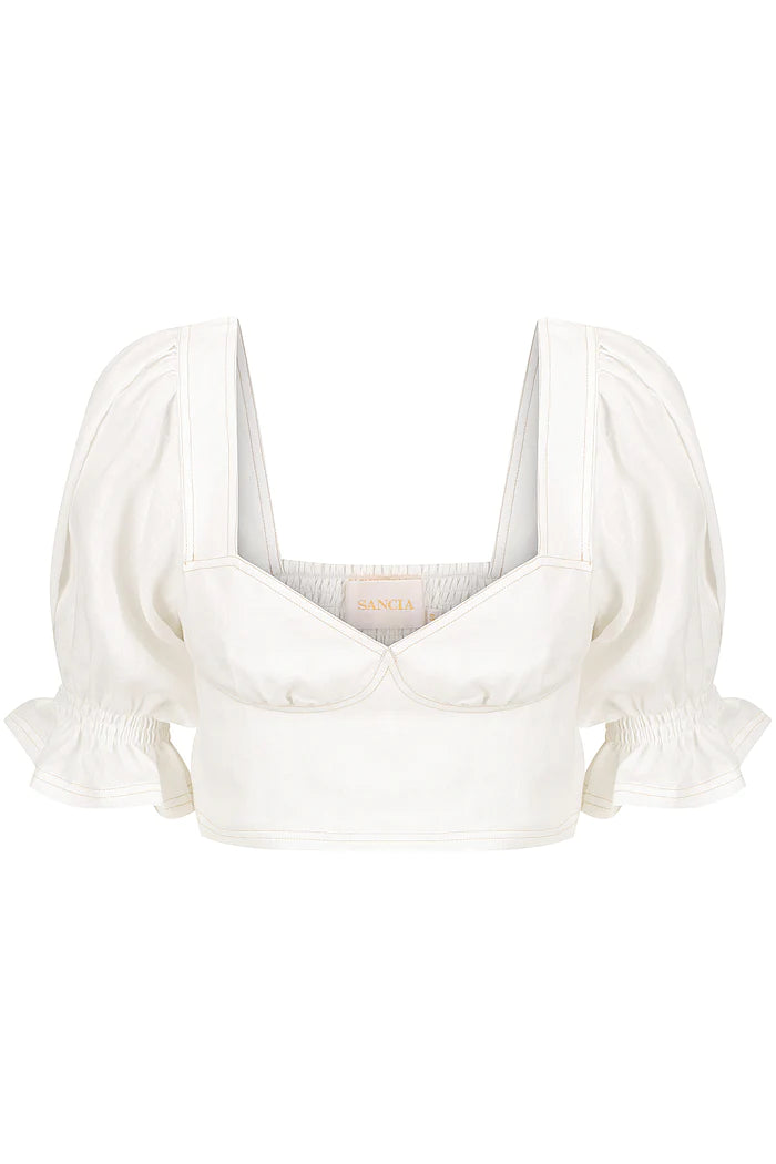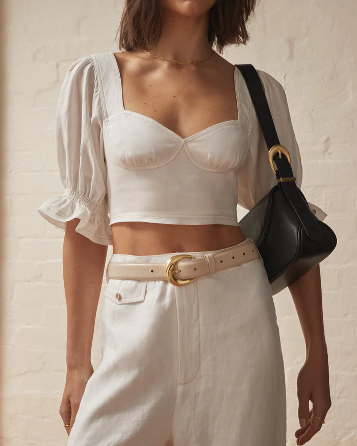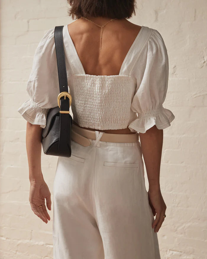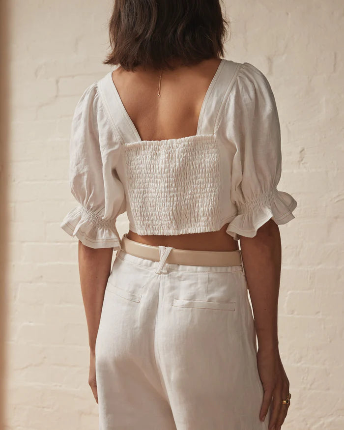 The Lola Top is a reimagined vintage shape with a contemporary twist. Made from soft natural fibres, the romantic piece has a sweetheart neckline with contrast stitching to beautifully highlight the shape of the bust. The lovely blouson sleeves sit just above the elbow with shirred cuffs for comfortability. The back of the garment is shirred to create an ease to wear. The cropped cut will go so well with high-rise denim or trousers.