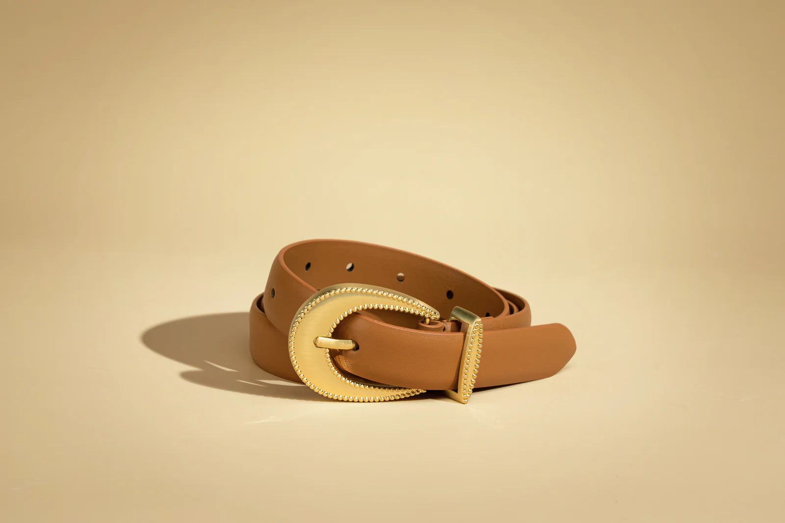 The Mazara belt will add a touch of sophistication to every outfit. The supple full grain leather is accentuated with a rounded, sculptural buckle with textured brushed gold that was custom designed in-house. Pair with your favourite jeans or tailored pants.