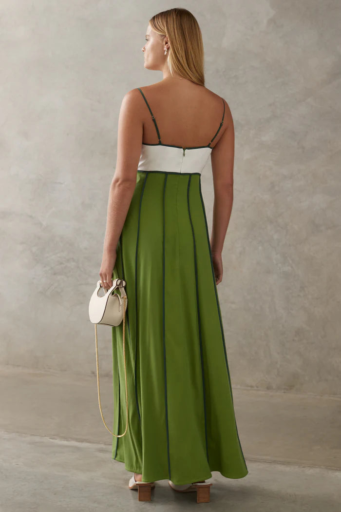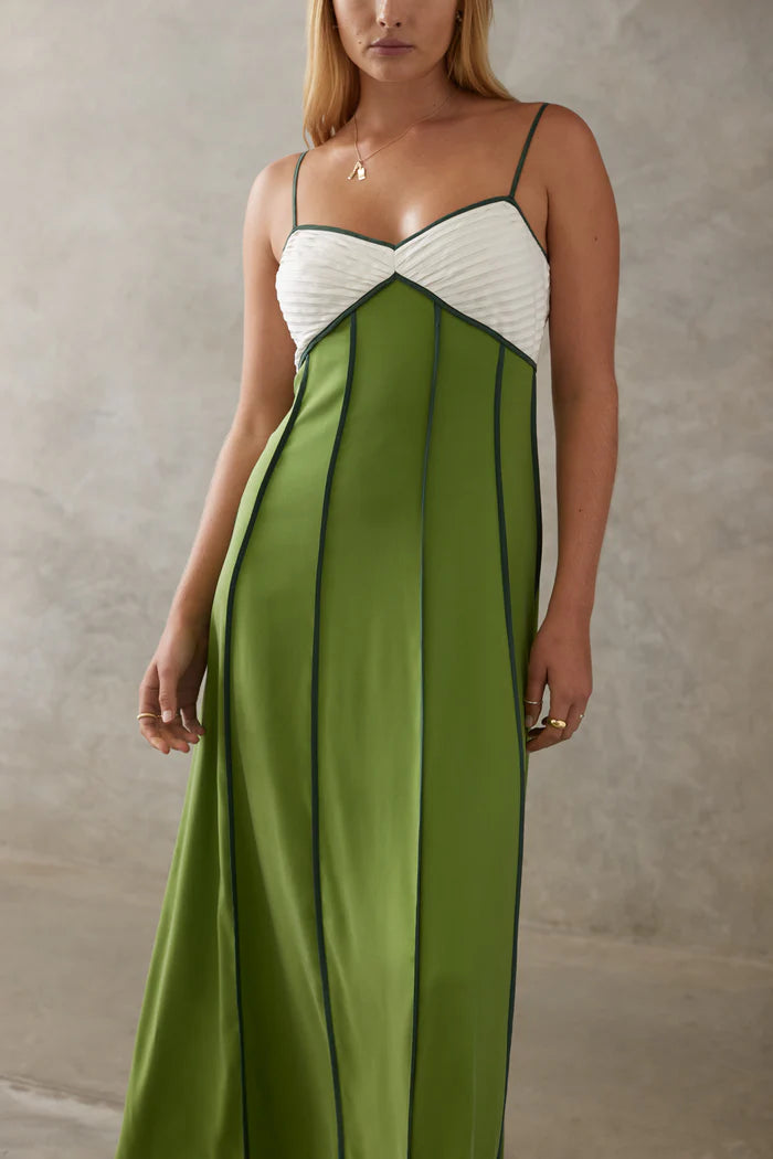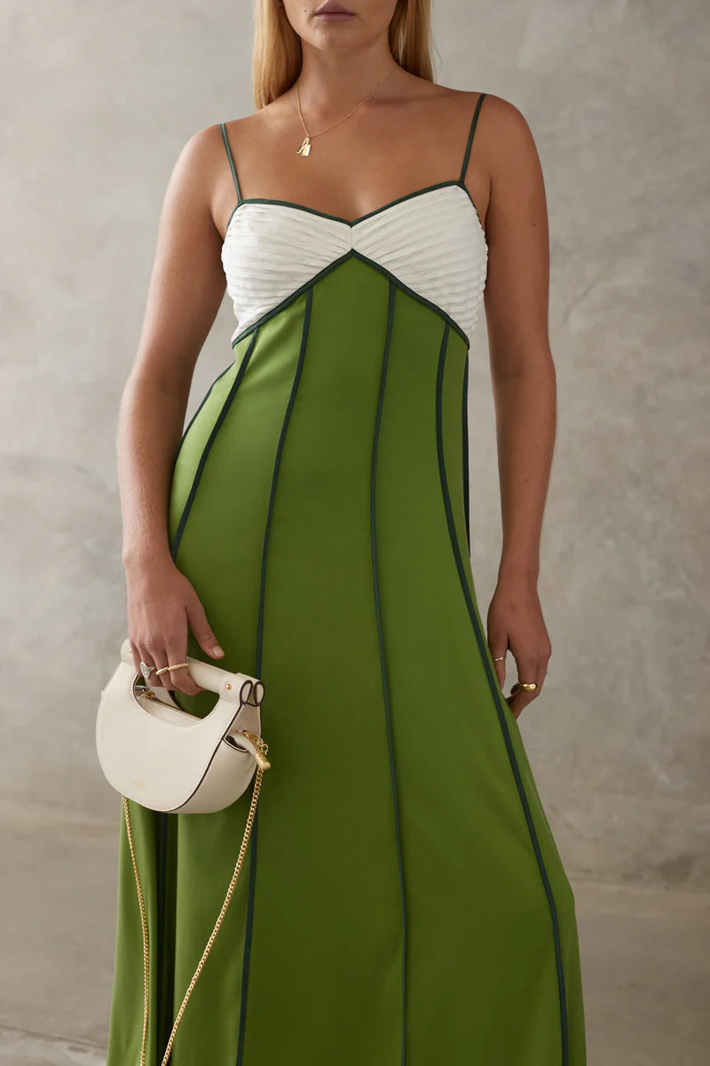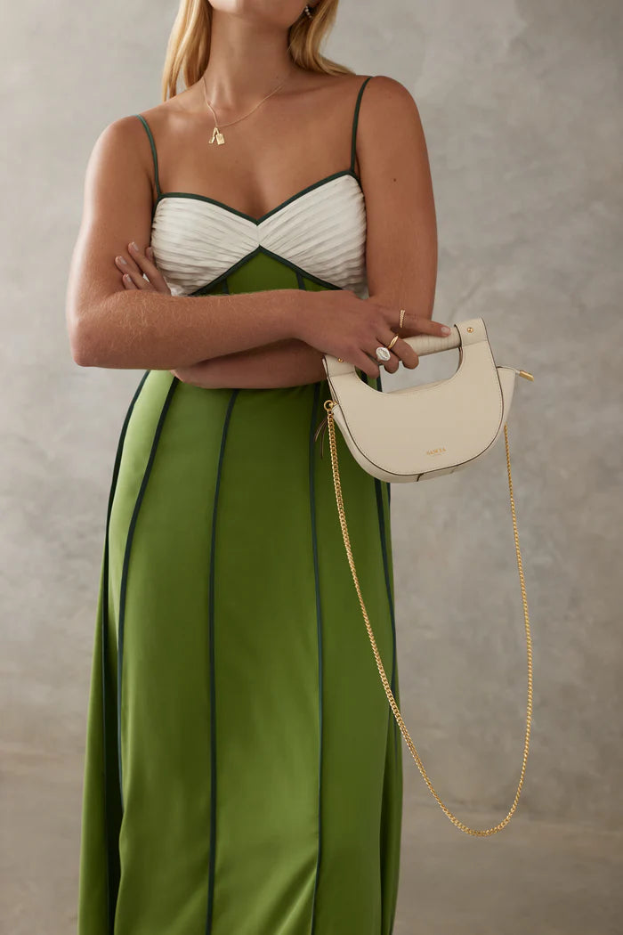 Introducing the Odele Dress. Exquisitely crafted with a delicate pintucking feature at bust and floaty panelled skirt with contrast binding. Our palm colourway in our signature cupro viscose blend and our Porcelain in our cupro rayon blend. The perfect occasion dress to be paired with our Merida Bag.